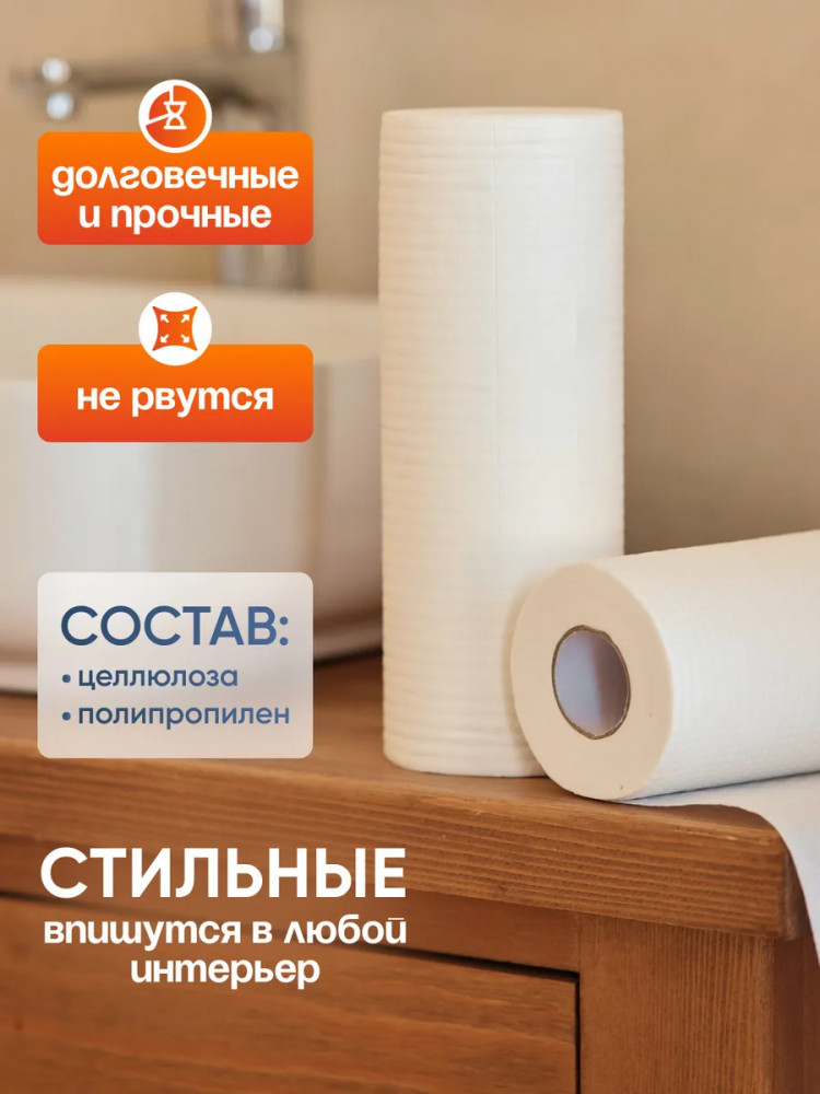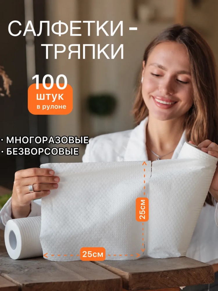 Многоразовые салфетки без ворса отрывные в рулоне — прочные и нетканые тряпочки, мини полотенца универсальные, подойдут как для домашней уборки, так и для салонов красоты, маникюра, педикюра, для косметалогических процедур. Так же подойдет для вытирания рук или лап кошнек и собак, сухой безворсовой салфеткой. Безворсовые влаговпитывающие салфетки впитывают влагу лучше своих аналогов: вискозные, из спанлейса или тканевые. Плотные, не растянутся, от воды не растекутся. Наш набор тряпок в рулоне отличная альтернатива, с улучшенной формулой специальной полипропиленовой пропитки в составе целлюлоза. Неотъемлемый плюс- это их гигиеничность, в отличие от других кухонных тряпочек. После неоднократного использования, вы ее выбрасываете, а не несете стирать. Никогда не начнет вонять, как салфетки из микрофибры.