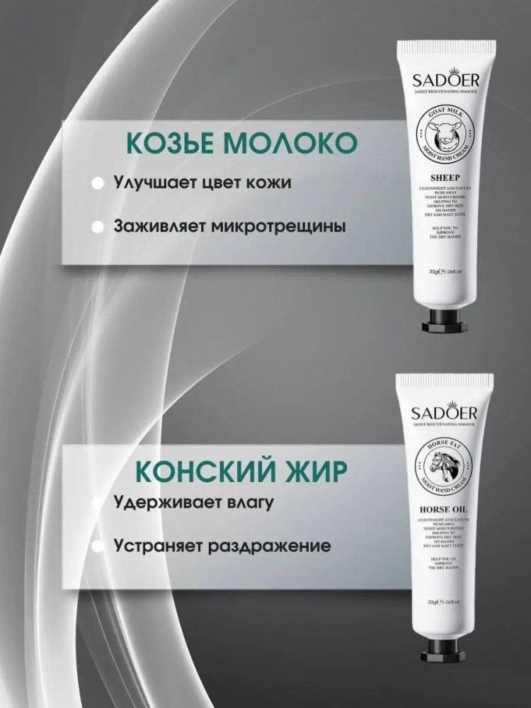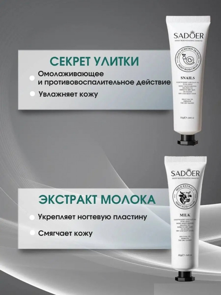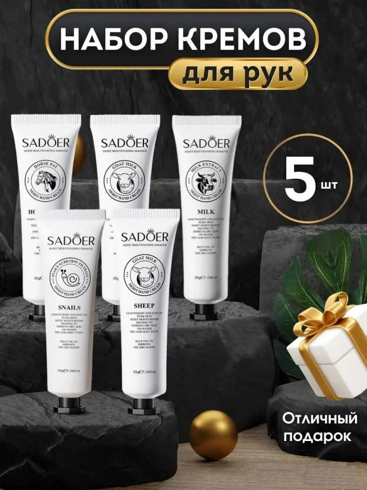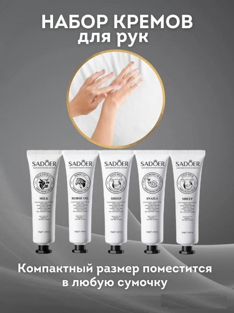 SADOER Набор кремов для рукВ данный момент этот товар отсутствует в продаже. Возможно, у нас найдется аналогичный или похожий товар здесь. Крем для рук от Sadoer — это увлажняющее и питательное косметическое средство, которое поможет беспощадно справиться с различными проблемами, связанными с кожей рук. В мини набор входит 5 штук крема с экстрактами коровьего, козьего молока, лошадиного масла и муцина улитки. Данный крем обеспечивает максимальное увлажнение, защиту и питание кожи рук. Он эффективно увлажняет даже самую сухую кожу, смягчает шелушения и успокаивает раздражения. Крем обладает регенерирующим действием, помогает в заживлении микротрещин после маникюра и предотвращает образование новых. Благодаря уникальной органической формуле, наш крем выступает в роли эффективного барьера против внешних неблагоприятных факторов и защищает кожу рук от холода и сухости. Крем обладает приятным, ненавязчивым запахом, который не будет конфликтовать с вашими любимыми парфюмерными композициями. Он быстро впитывается и не оставляет жирной пленки на коже, что делает его удобным для использования в любое время дня. Ночной вариант крема позволит вашим рукам насладиться дополнительным уходом и восстановлением во время сна, а дневной вариант поможет сохранить и поддержать увлажнение и гладкость в течение дня. |