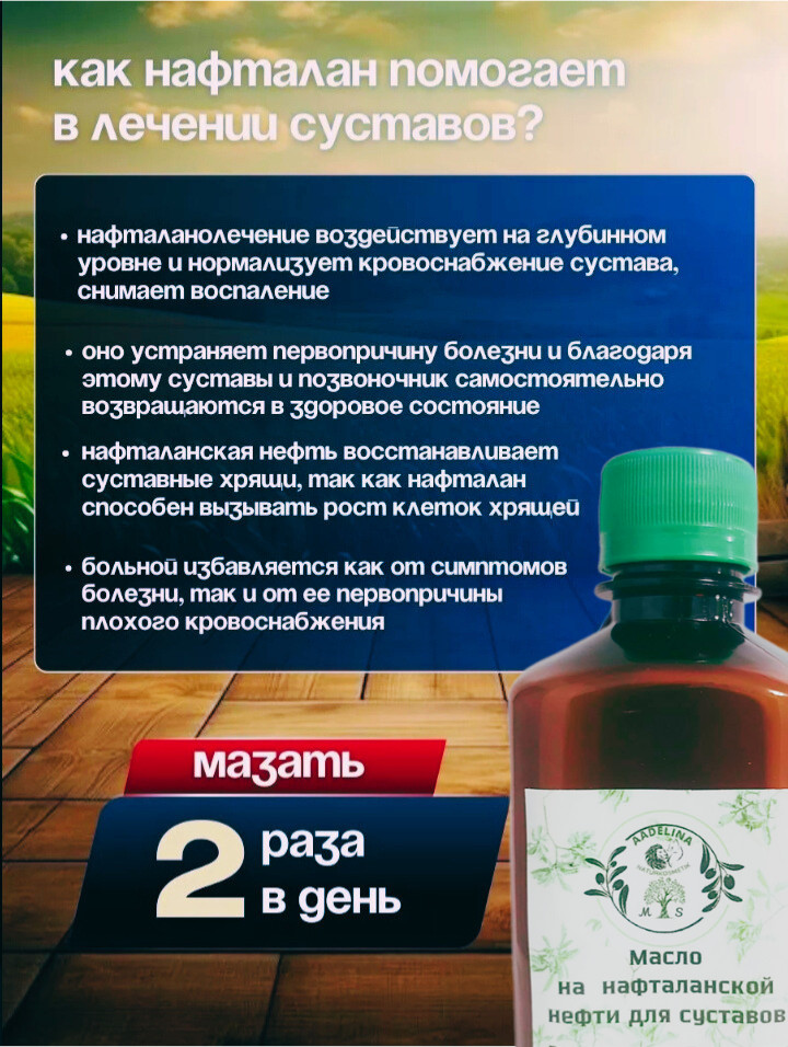 Как нафталан помогает в лечении суставов? Нафталанолечение воздействует на глубинном уровне и нормализует кровоснабжение сустава, снимает воспаление. Оно устраняет первопричину болезни и благодаря этому суставы и позвоночник самостоятельно возвращаются в здоровое состояние Нафталанская нефть восстанавливает суставные хрящи, так как способен вызывать рост клеток хрящей Больной избавляется как от симптомов болезни, так и от ее первопричины — плохого кровоснабжения В первый же день лечения запускается восстановительный процесс и купируется болевой синдром. Уже через 10 дней ощущается улучшение.