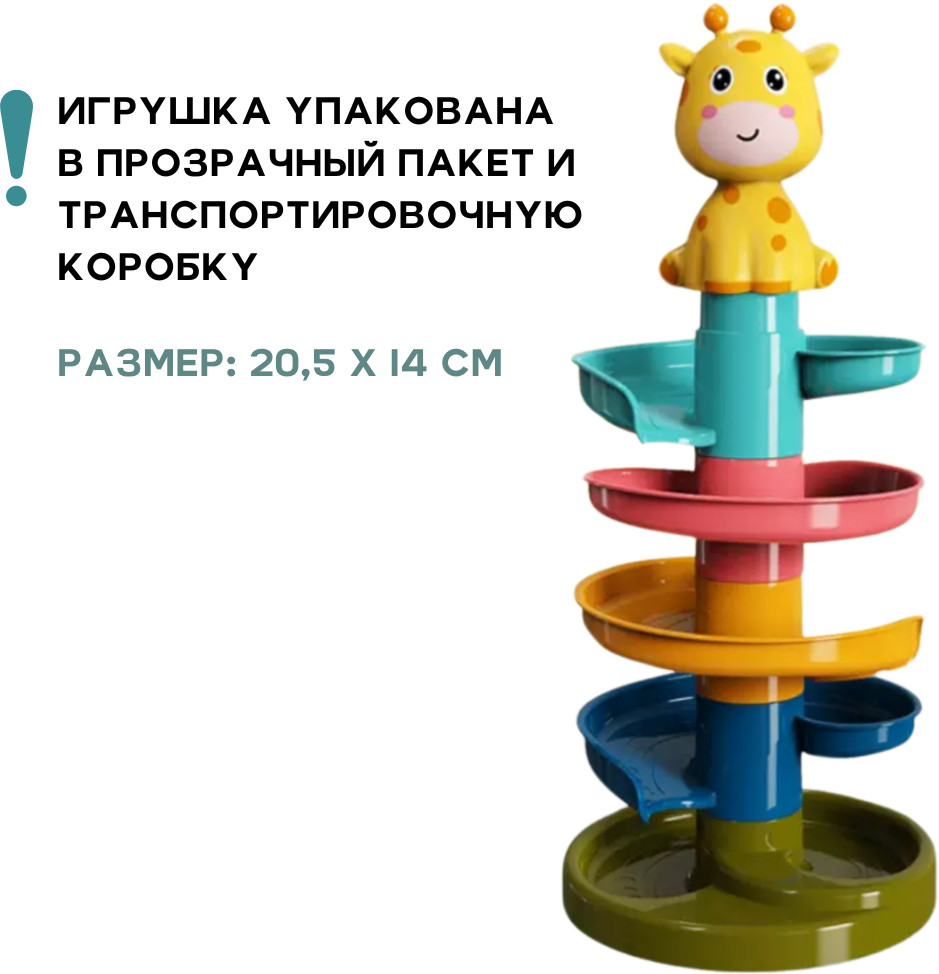 Пирамидка для малышей «Горка с шариками»В данный момент этот товар отсутствует в продаже. Возможно, у нас найдется аналогичный или похожий товар здесь. Пирамидка горка состоит из 5 разноцветных частей и фигурки жирафа. Если положить шарики на верхний этаж, можно наблюдать, как они весело и звонко скатываются вниз по серпантину. Уровни можно ставить в разном порядке и использовать пирамидку, как конструктор для малышей, изучать цвета и обучаться счету. |