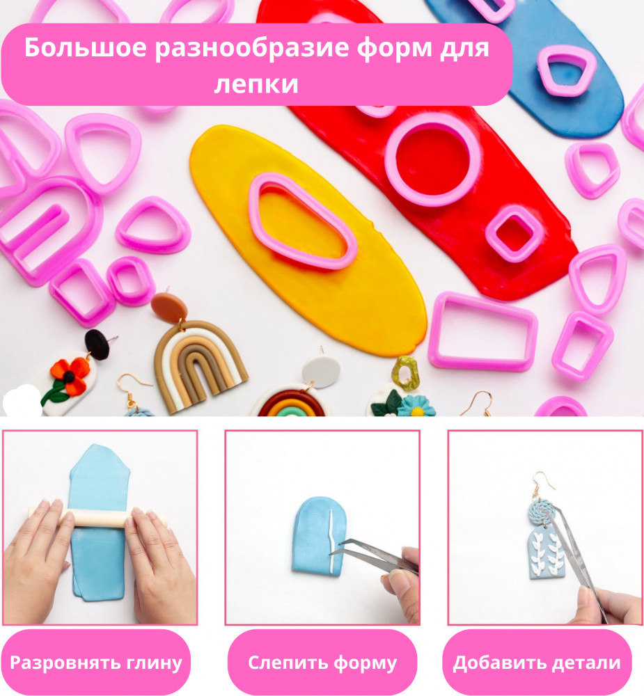 Комплектация: коробка, инструменты, глина, формы, крючки, фольга, кольца.