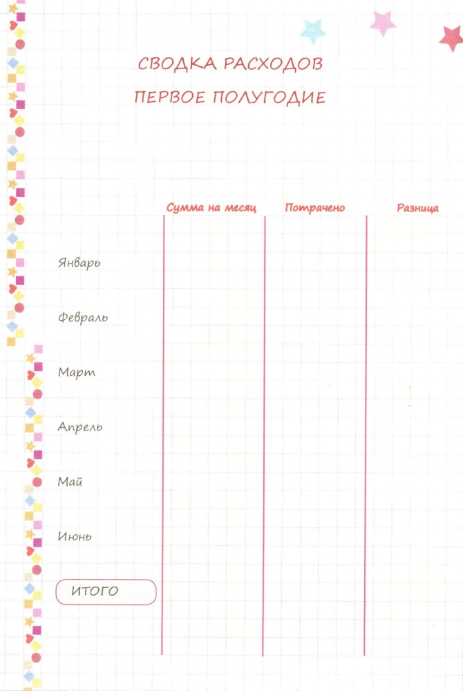 Купила книжки для себя и в подарок для мам. Всем понравились! Компактная и красочная книжка; пункты на основные траты уже есть, а также есть таблица для ежедневных трат, ежемесячных трат и в конце книги сводка расходов за 2 полугодия. Мне кажется, для анализа расходов и для накопления капитала очень удобно.