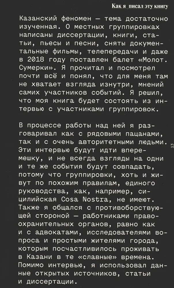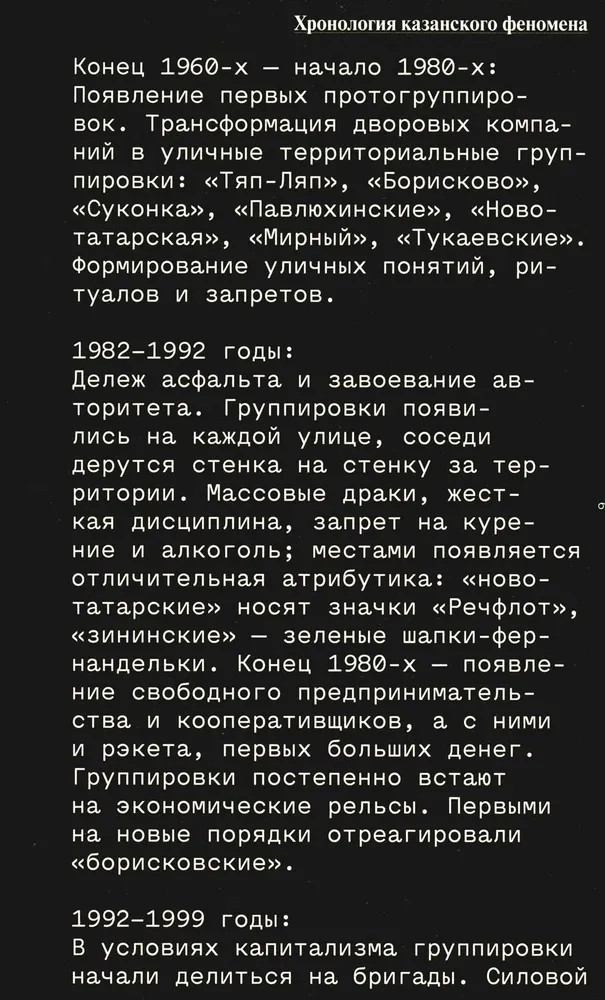 Если вы выросли в России в конце XX века, то в вашей жизни были уличные драки. Эта книга о тех, кто сделал насилие своим кредо: бил и попадал под раздачу — профессионально, ежедневно, беспощадно. Это пацаны, участники бесчисленных молодежных группировок, наводнивших поздний Советский Союз. Первым городом, в котором явление стало по-настоящему массовым, была Казань.Роберт Гараев, автор этой книги, попал в «Низы», одну из местных банд, еще в средней школе. Спустя 30 лет он решил выяснить, откуда взялся казанский феномен — полторы сотни подростковых группировок, что сначала «делили асфальт» в драках район на район, а затем начали массово истреблять себе подобных, — и как вспоминают те суровые дни сами пацаны, бывшие сотрудники милиции, адвокаты и простые жители города, обезображенного страхом и жестокостью. Это единственная книга, целиком составленная из голосов выживших — и желающих рассказать правду.