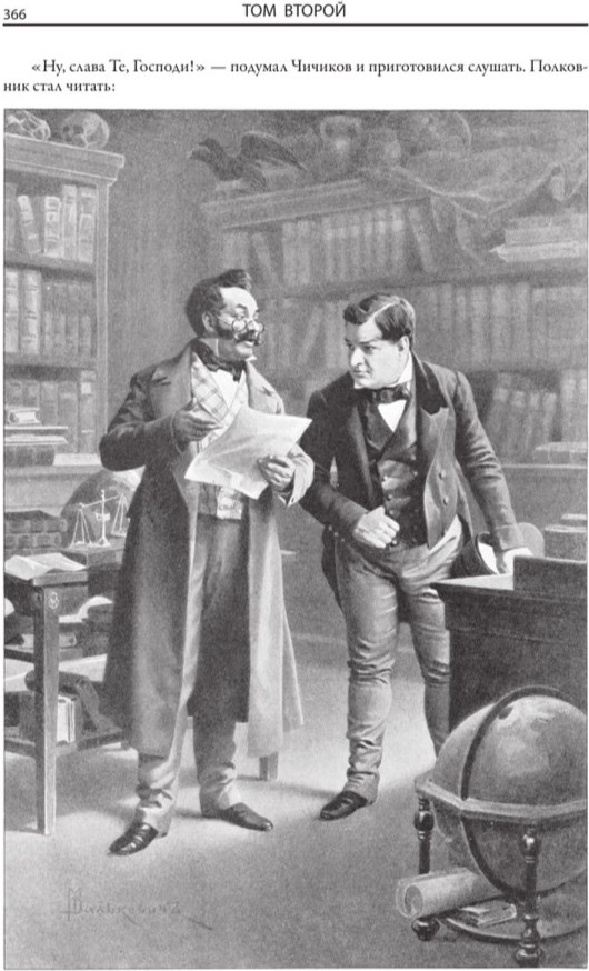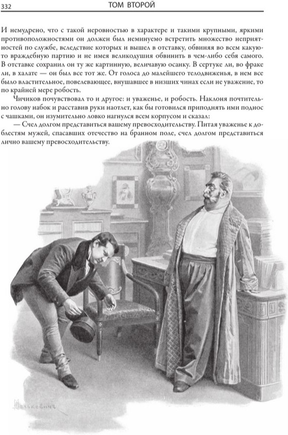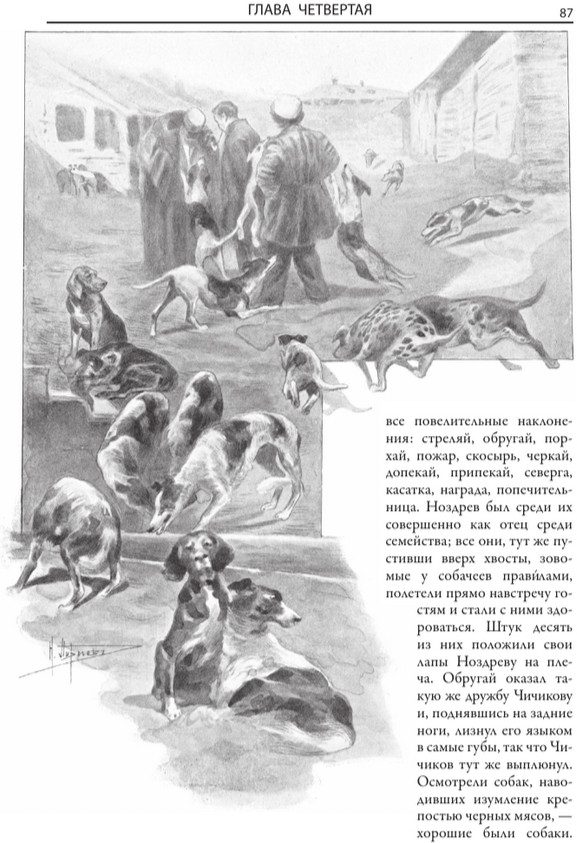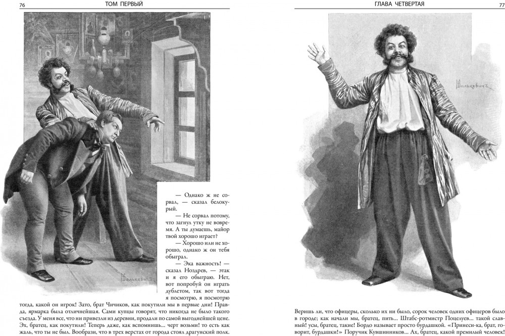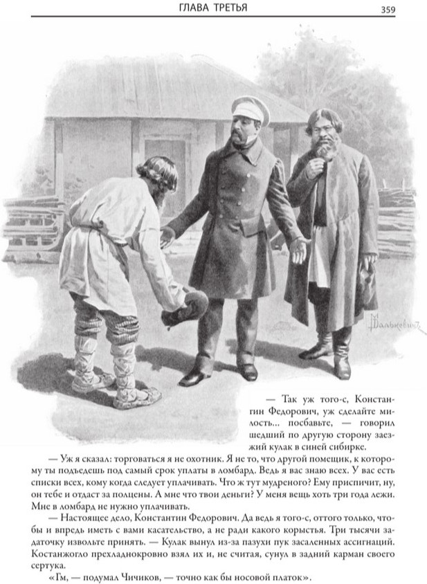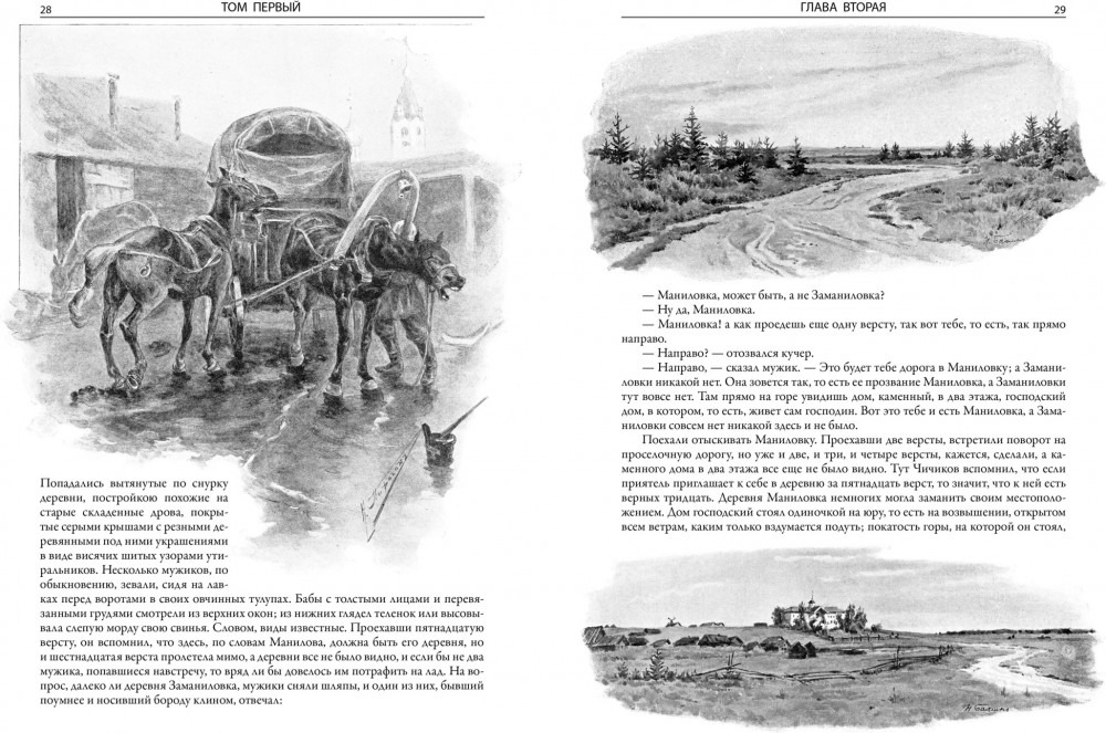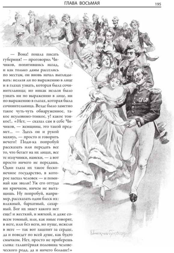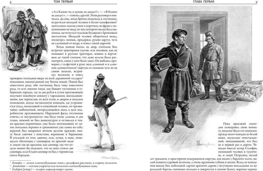 До конца грандиозный замысел осуществить не удалось: практически готовый второй том был утерян, сохранилось лишь несколько глав в черновиках, а третий том так и не был написан. В настоящее издание вошли полный текст первого тома «Мертвых душ», глава из приложений к первому тому и позднейшая редакция неоконченного второго тома. Немалый интерес вызывают и использованные в оформлении рисунки. В 1901 году петербургский издатель Адольф Федорович Маркс осуществил роскошное иллюстрированное издание поэмы. К работе над ним была привлечена большая группа талантливых художников, работавших по единому замыслу; руководили творческим коллективом искусствовед Петр Петрович Гнедич и живописец Мечислав Михайлович Далькевич. Художники сделали 365 замечательных иллюстраций: В. А. Андреев, А. Ф. Афанасьев, В. И. Быстренин, М. М. Далькевич, Ф. С. Козачинский, И. К. Маньковский, Н. В. Пирогов и Е. П. Самокиш-Судковская воспроизвели бытовые сцены произведения, Н. Н. Бажин и Н. Н. Хохряхов исполнили пейзажи, а Н. С. Самокиш — буквицы и виньетки. |
