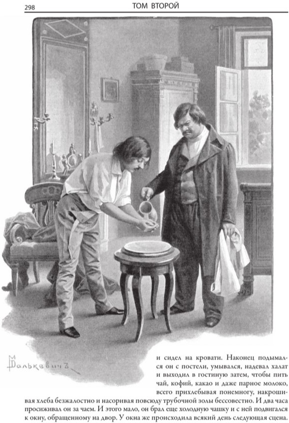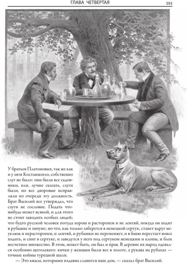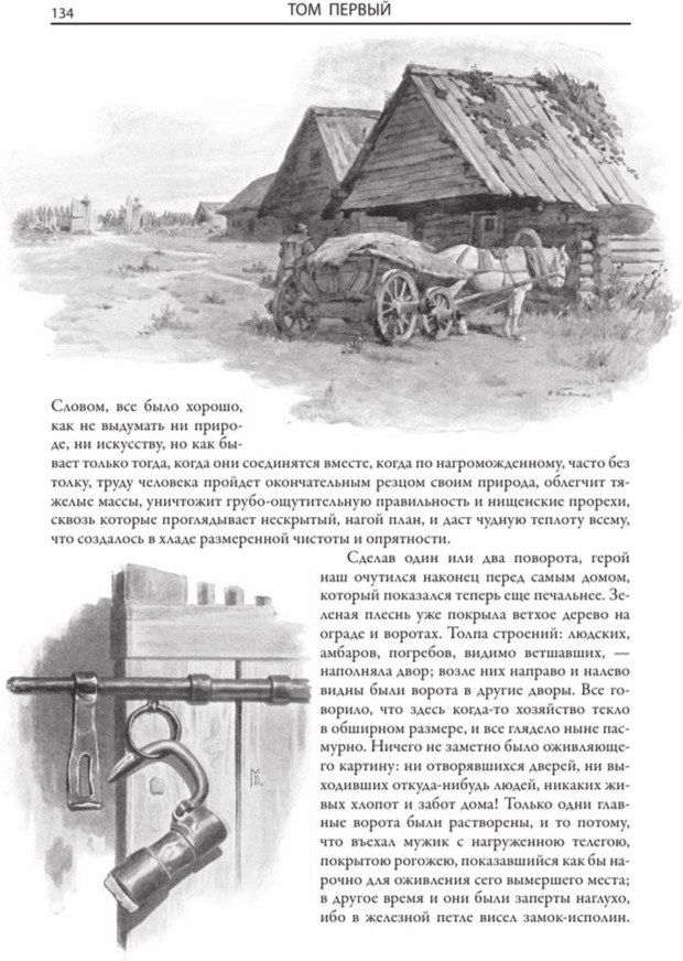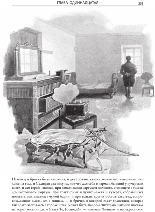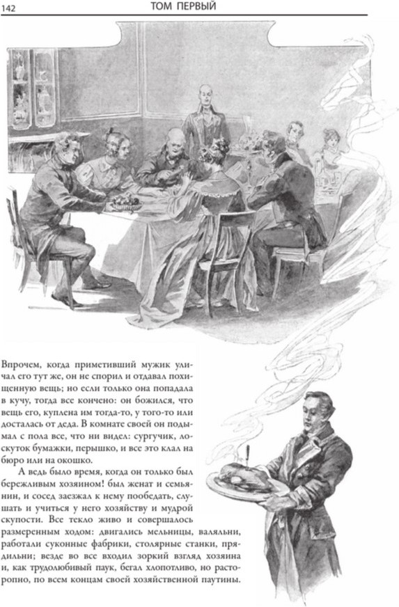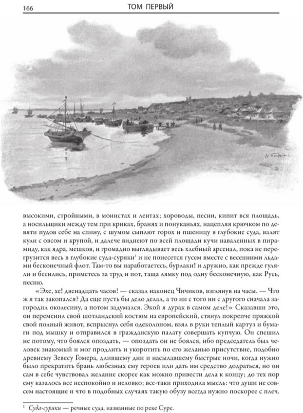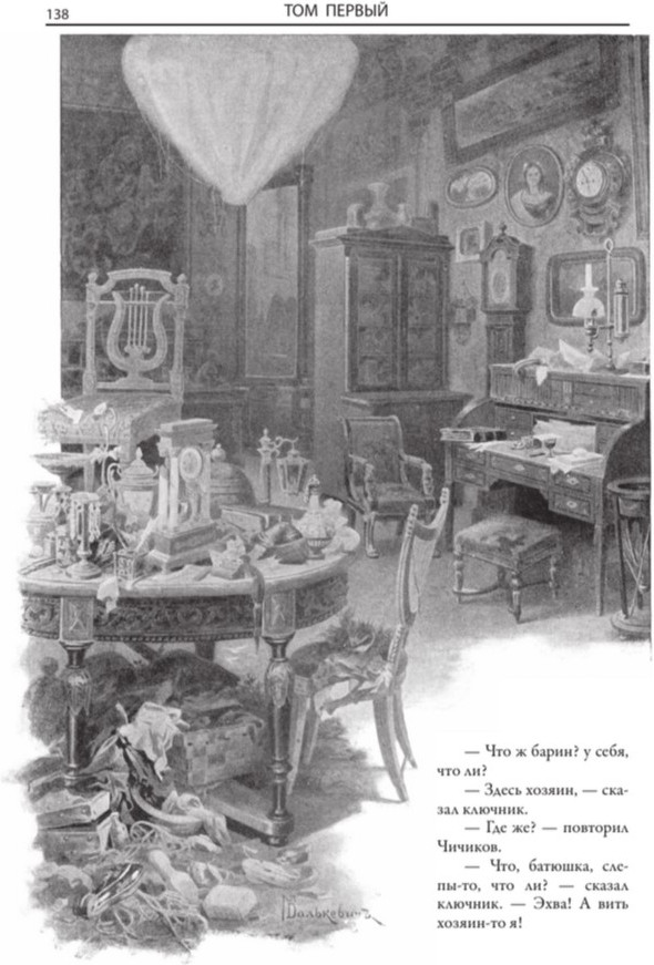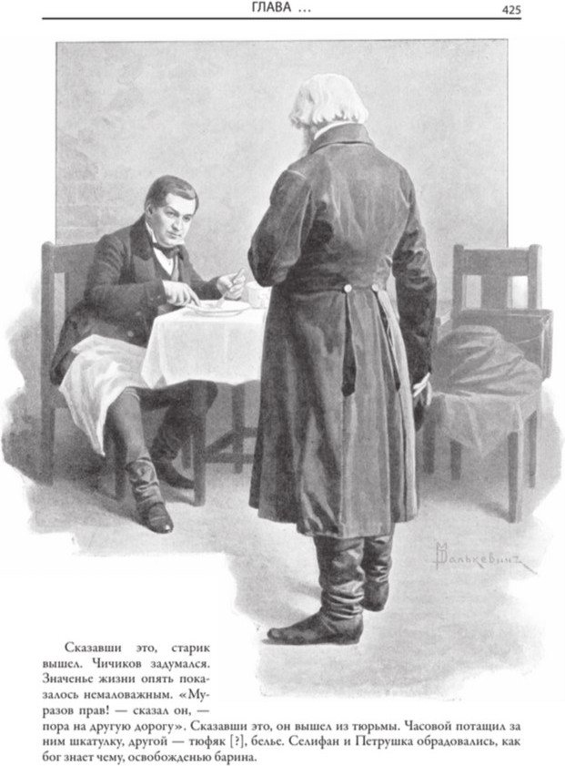 До конца грандиозный замысел осуществить не удалось: практически готовый второй том был утерян, сохранилось лишь несколько глав в черновиках, а третий том так и не был написан. В настоящее издание вошли полный текст первого тома «Мертвых душ», глава из приложений к первому тому и позднейшая редакция неоконченного второго тома. Немалый интерес вызывают и использованные в оформлении рисунки. В 1901 году петербургский издатель Адольф Федорович Маркс осуществил роскошное иллюстрированное издание поэмы. К работе над ним была привлечена большая группа талантливых художников, работавших по единому замыслу; руководили творческим коллективом искусствовед Петр Петрович Гнедич и живописец Мечислав Михайлович Далькевич. Художники сделали 365 замечательных иллюстраций: В. А. Андреев, А. Ф. Афанасьев, В. И. Быстренин, М. М. Далькевич, Ф. С. Козачинский, И. К. Маньковский, Н. В. Пирогов и Е. П. Самокиш-Судковская воспроизвели бытовые сцены произведения, Н. Н. Бажин и Н. Н. Хохряхов исполнили пейзажи, а Н. С. Самокиш — буквицы и виньетки. |