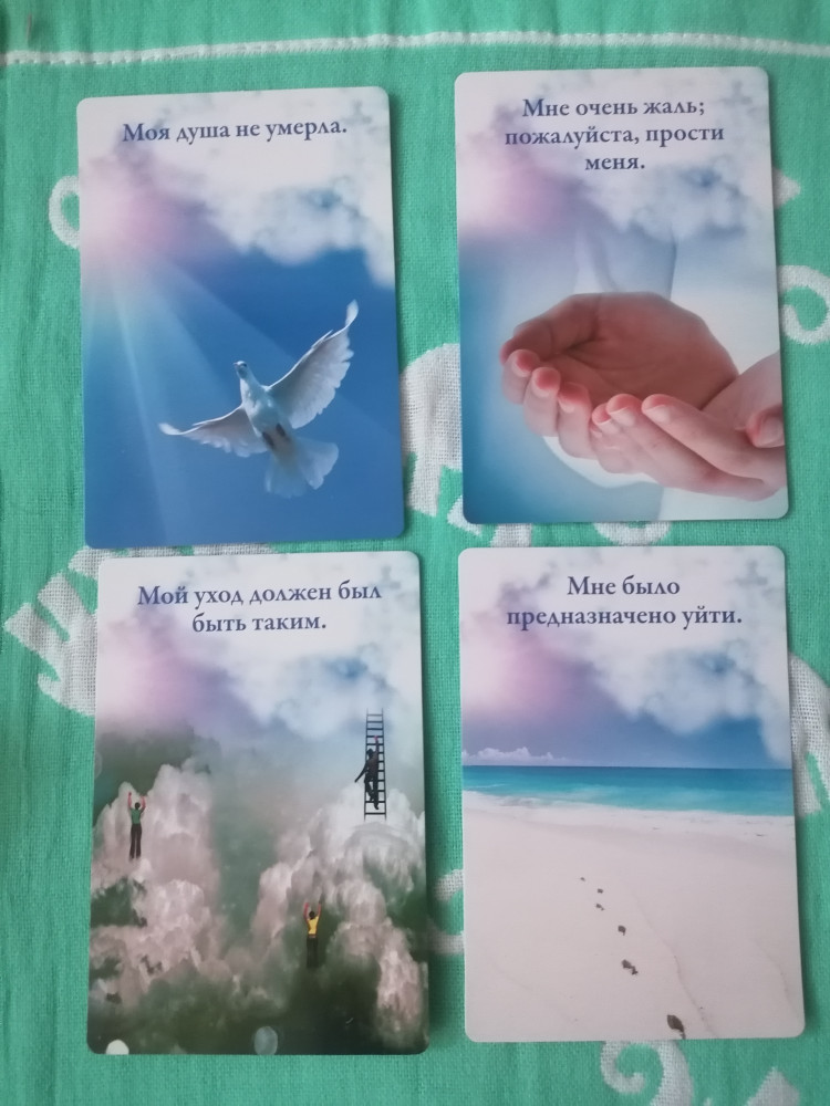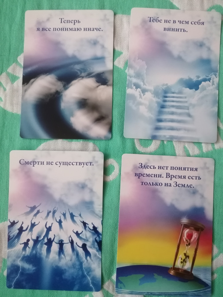 Сегодня приобрела эти замечательные карты. Для тех, кто потерял близких, будет о чем поговорить и вщаимодействовать с колрдой. Эти карты помогают пережить боль и вообще взглянуть на этот мир и законы жизни иначе. Я недавно потеряла отца...и на данном этапе в моей жизни эти карты - лучшее лечение.