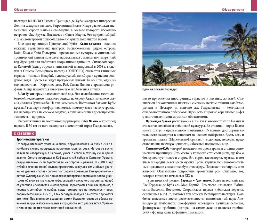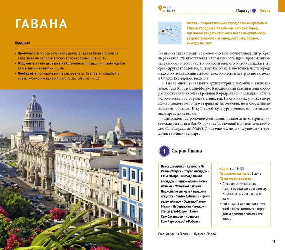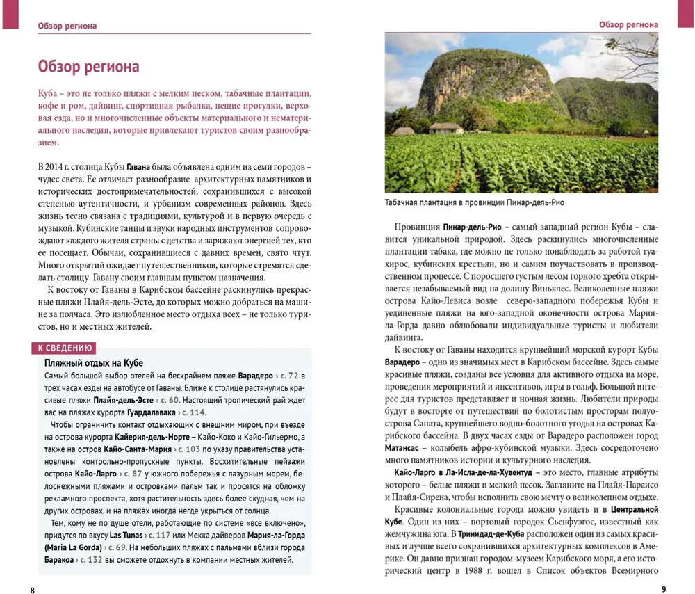 Обязательно посетите Гавану, где рядом очаровательными строениями Старого города выросли современные кварталы Ведадо и Мирамар, построенные в стилях модерн и арт-деко, а по набережной Малекон до сих ездят старые американские и советские автомобили. И, конечно же, музыка. Она доносится из каждого бара. К востоку от Гаваны расположены красивые пляжи, до которых можно добраться всего лишь за полчаса. Через западную провинцию Пинар-дель-Рио протянулся поросший густыми лесами горный хребет, вокруг которого раскинулись плантации табака. Отсюда открываются фантастические виды на долину Виньялес. Ну а пляжи острова Кайо-Левиса давно облюбовали индивидуальные туристы и поклонники дайвинга. К востоку от Гаваны раскинулся самый большой курорт Кубы Варадеро, хорошо знакомый российским туристам. Любители природы будут в восторге от путешествий по болотистым просторам полуострова Сапата. Рядом с побережьем растянулись популярные среди туристов, предпочитающих стандарт «все включено » , острова Хувентуд и Кайо-Ларго.