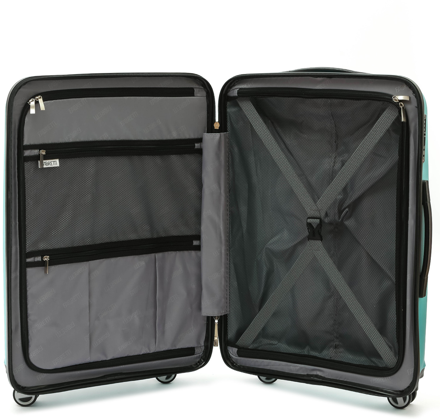 Универсальный чемодан Fabretti среднего размера (M) выполнен из полипропилена — современного материала, для которого характерны высокая ударопрочность, стойкость к перепадам температур, отличная износостойкость. Внутри находятся 2 отделения: одно — с эластичными ремнями-фиксаторами, другое — с тканевой перегородкой на молнии и двумя карманами на молнии. Выдвижная ручка фиксируется в 3-х положениях. Сверху и сбоку предусмотрены ручка для удобства переноски. 4 двойных колеса вращаются на 360°, позволяя чемодану двигаться легко и плавно, что уменьшает нагрузку на руки и спину. Чемодан оснащен кодовым замком TSA, который обеспечивает беспрепятственный досмотр багажа в случае необходимости.