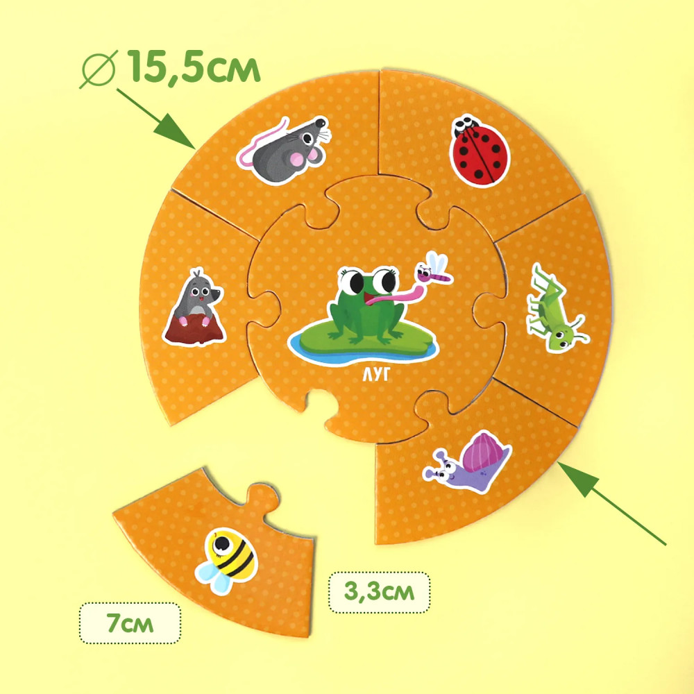 💳 Оплатить за товар можно при получении 🇰🇿 Есть бесплатная доставка по Казахстану от 1 дня 🎁 Копите бонусы с каждой покупки Круговые пазлы-ассоциации «Животные» от Malamalama — это простой и интересный способ всестороннего развития малыша. Пазлы созданы, чтобы сделать весёлую игру полезной: развивайте мелкую моторику, логику, мышление, расширяйте кругозор ребёнка, учите новые слова — названия цветов и предметы, которые им соответствуют. Внутри шесть круговых пазлов с крупными деталями и объединяющими центрами, с которыми можно играть в разные познавательные игры. Можно придумать свои игры, а можно воспользоваться инструкцией. Узнавайте новое, играя! |
