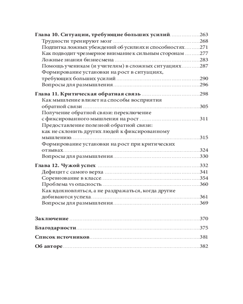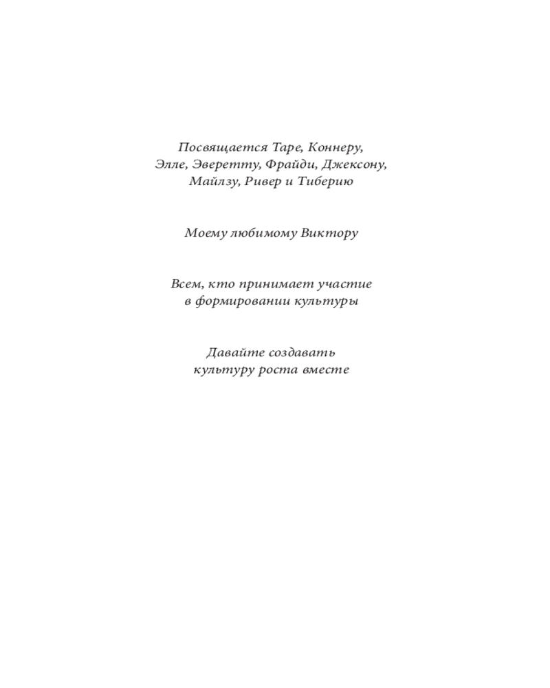 «Культура роста» работает не только в корпорациях. Она повышает результаты в школах, некоммерческих организациях, спортивных командах (и даже семьях). И достаточно «перенастройки мышления» всего 10% коллектива, чтобы изменения начались. В личностном плане это работает точно так же, особенно в сложных ситуациях, когда мы решаем трудные задачи или сталкиваемся с критикой. Главная мысль такова: каждый из нас силен, и даже в одиночку мы способны очень на многое. Однако во сто крат важнее — сотрудничать для реализации потенциала. |