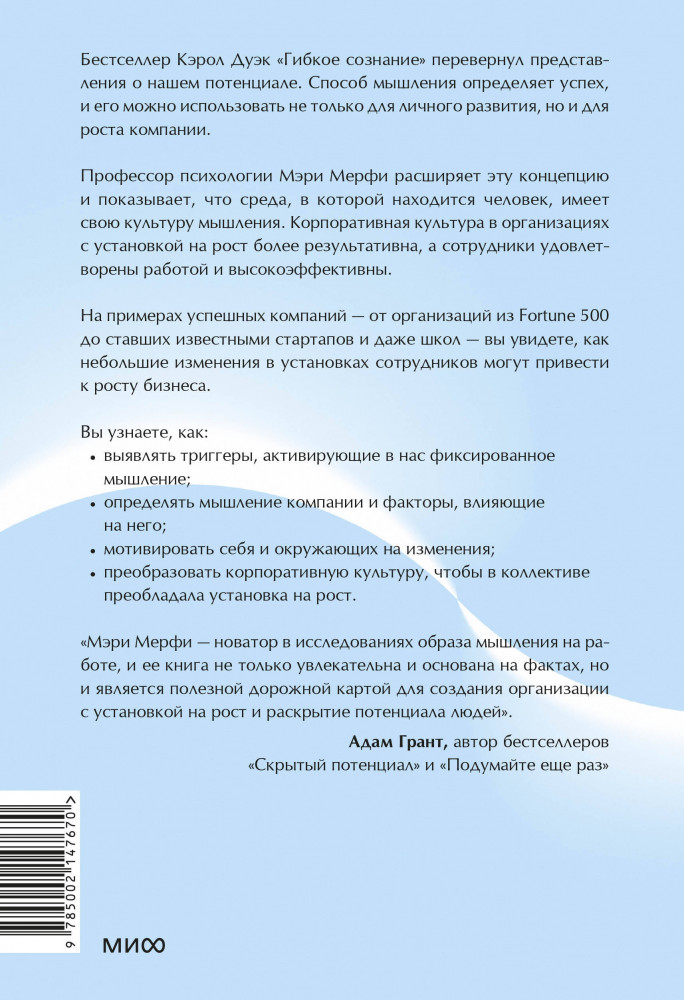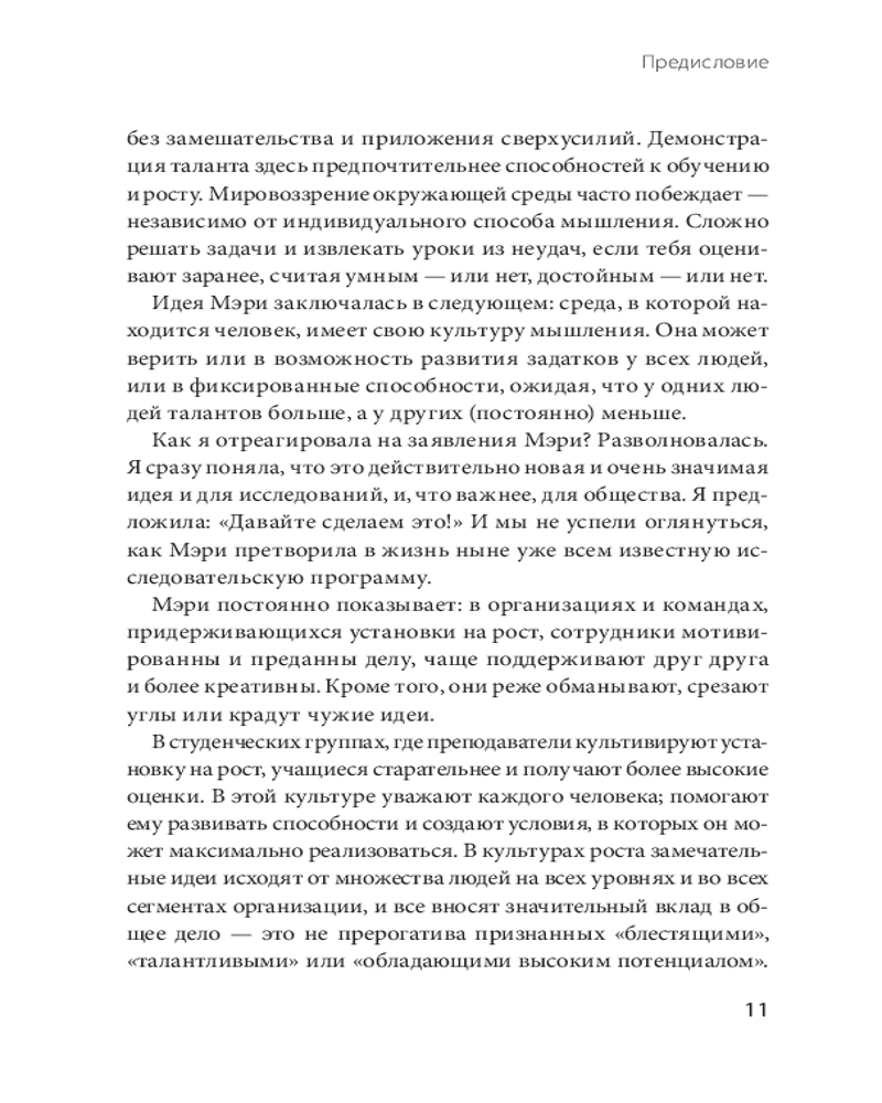 Подобные ожидания — признак фиксированного мышления, «культуры гениев», которым всё удается. Но есть и альтернатива — «культура роста»: не только личная, но и корпоративная устремленность к постоянному развитию. Здесь ценится не олимпийская высота, а долгий путь в гору, не «звездный блеск», а обучение и открытость. Такой тип мышления можно развивать — причем делать это стоит не одному, а в команде. Мэри Мерфи — профессор психологии и наук о мозге в Университете Индианы — развивает идеи «гибкого сознания» Кэрол Дуэк в отношении корпоративной культуры. Ее книга, переведенная на 10 языков, — результат многолетней работы с компаниями из списка Fortune 500. На их примере — и основываясь на новаторских исследованиях — Мерфи показывает, как настраивать себя и окружающих на мышление роста. И что конкретно изменить, чтобы процесс пошел.
