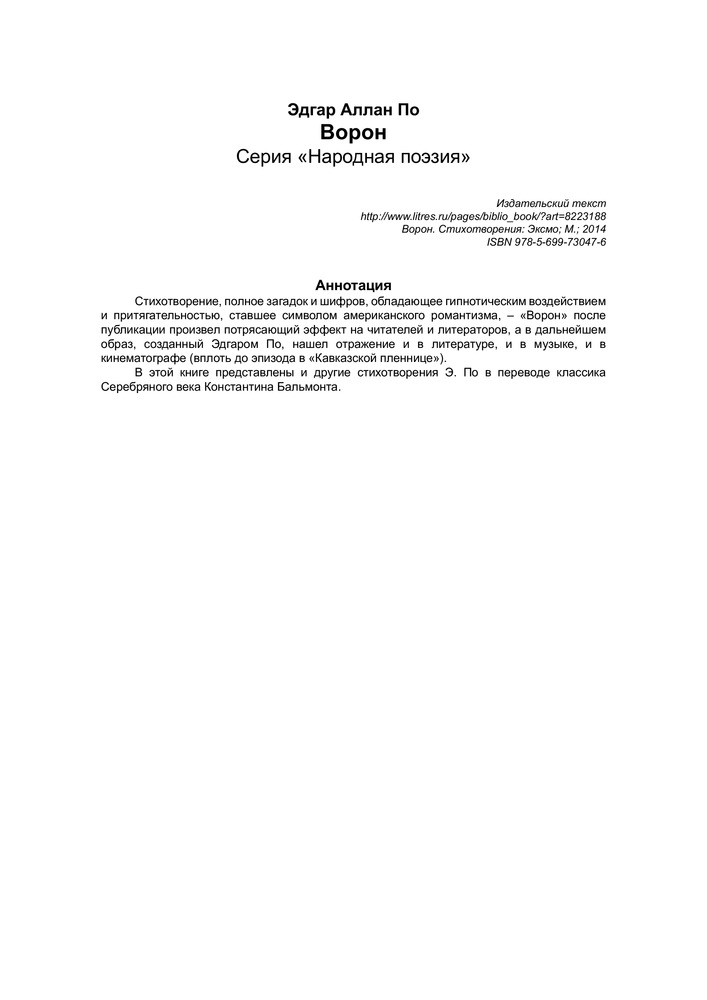 В данный момент этот товар отсутствует в продаже. Возможно, у нас найдется аналогичный или похожий товар здесь. Серия: Народная поэзия Стихотворение, полное загадок и шифров, обладающее гипнотическим воздействием и притягательностью, ставшее символом американского романтизма – «Ворон» после публикации произвел потрясающий эффект на читателей и литераторов, а в дальнейшем образ, созданный Эдгаром По, нашел отражение и в литературе, и в музыке, и в кинематографе (вплоть до эпизода в «Кавказской пленнице»).