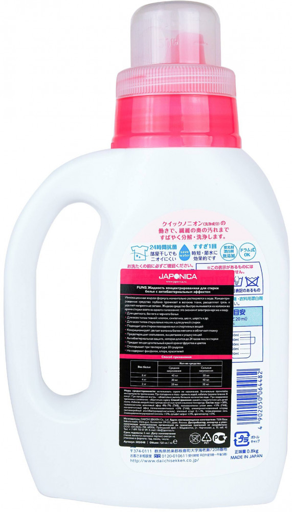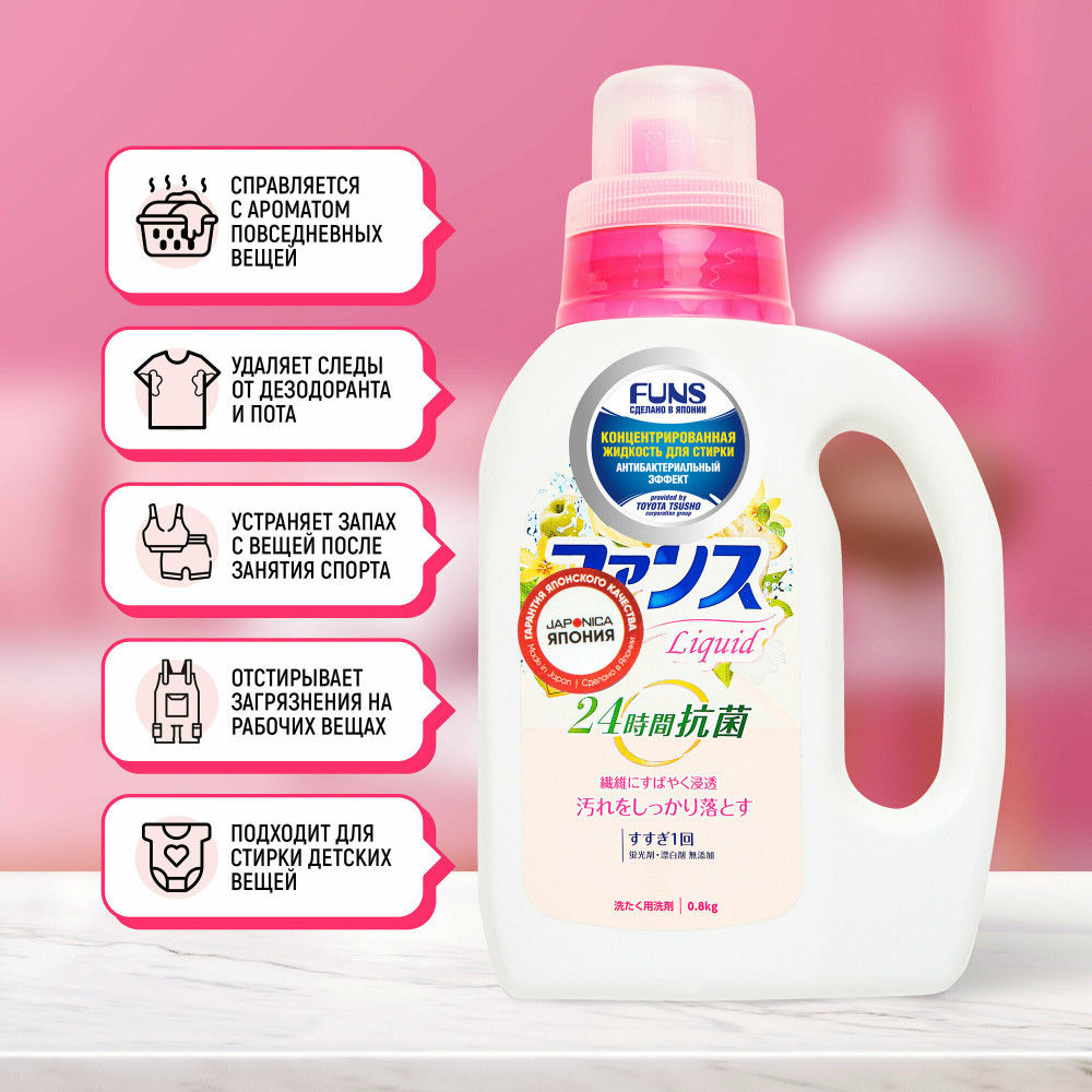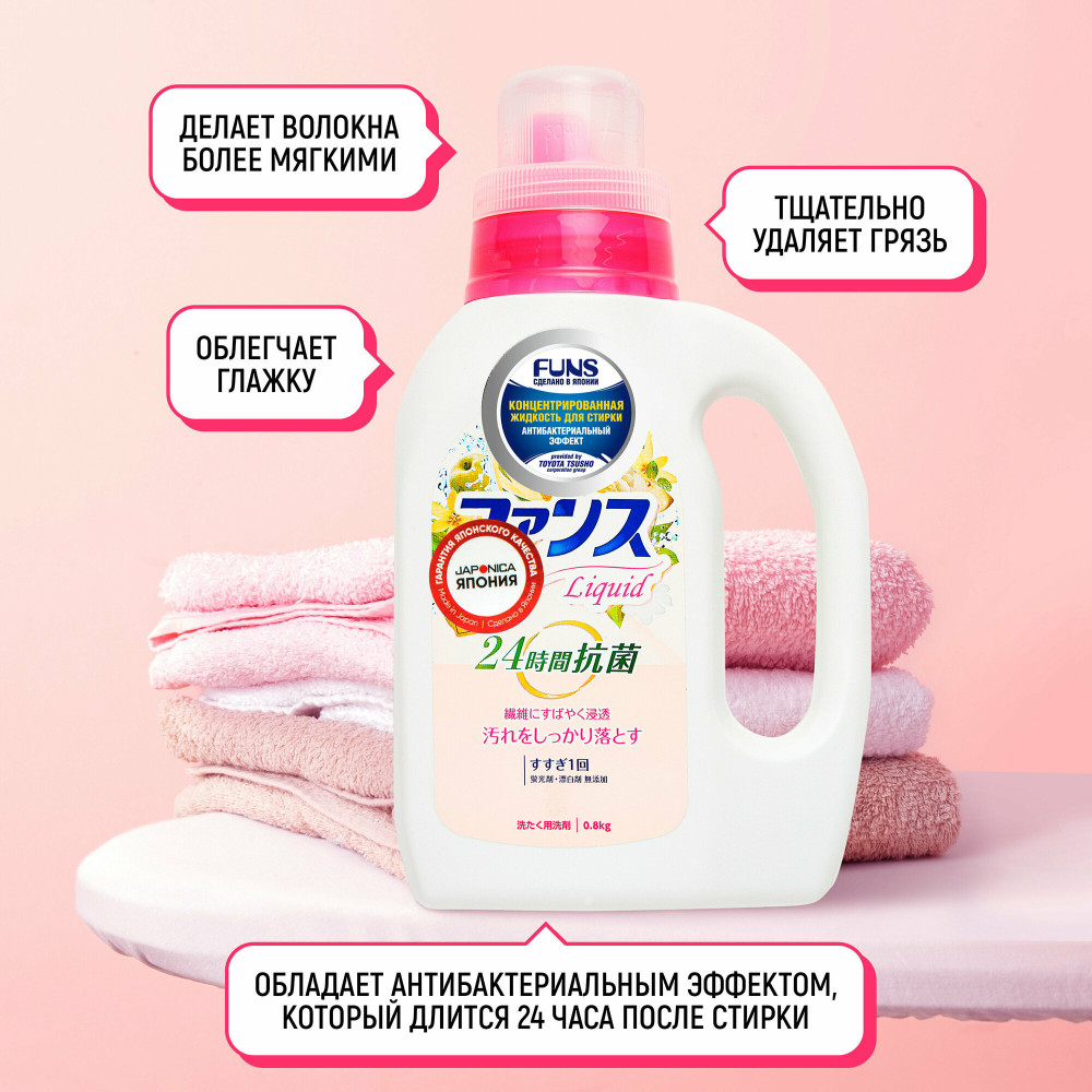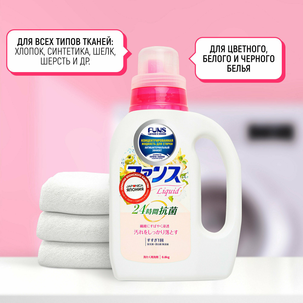 Инновационная жидкая формула моментально растворяется в воде. Средство глубоко проникает в волокна ткани, расщепляет грязь и удаляет неприятные запахи. Жидкое средство быстро вымывается из волокон во время стирки всего за одного полоскание: это экономит электроэнергию и воду. Подходит для цветного, белого и черного белья и всех типов тканей: хлопок, синтетика, шелк, шерсть и др. Подходит для стирки одежды с мембраной. Концентрированная формула. Обладает эффектом кондиционера: делает волокна более мягкими, облегчает глажку. Противостоит скатыванию, выцветанию и усадке вещей. Обладает антибактериальным эффектом, которое длится 24 часа после стирки. Для всех типов стиральных машин и для ручной стирки. Придает вещам длительный яркий аромат фруктов и цветов. Отстирывает при температуре 30 градусов. Не содержит фосфатов, хлора, красителей. Технологичность производства бытовой химии и высокие стандарты японского качества компании, входящей в Toyota Group, исключают вредное воздействие на окружающую среду.