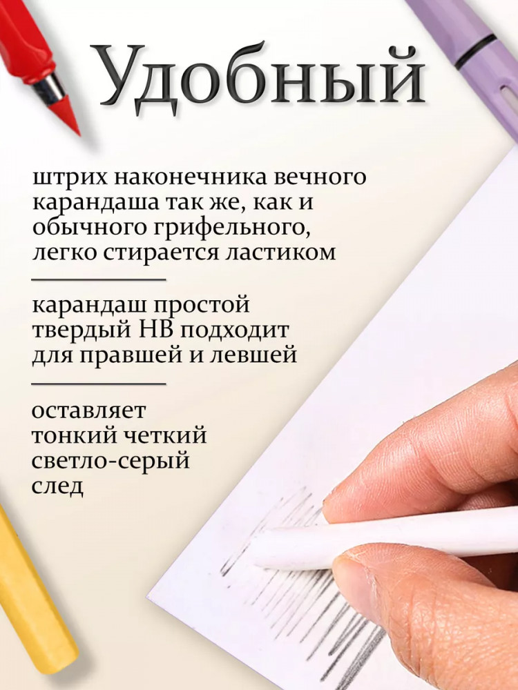 Вечные цветные карандашибез заточки встроенный ластик удобные оригинальный дизайн бледные цвета В данный момент этот товар отсутствует в продаже. Возможно, у нас найдется аналогичный или похожий товар здесь. Цветные карандаши — это обязательный элемент пенала, школьной канцелярии и офисных принадлежностей. Если вы ищете практичную, качественную школьную канцелярию, письменные принадлежности — вечные карандаши это лучшее решение. Вечный карандаш заменит до 100 обычных простых карандашей. Инновационный карандаш не требует заточки, хорошо стирается ластиком и не вредит экологии. Грифель карандаша выполнен из вольфрамового сплава, который при соприкосновении с бумагой оставляет след, идентичный обычному грифелю. Карандаш выглядит очень стильно, хорошо лежит в руке, грифель пишет тонко, но четко, без излишнего нажима. Внутри карандаша предусмотрен ластик, который чисто удаляет записи и рисунки, не повреждая бумагу и не оставляя следов. Теперь ластик никогда не потеряется! |