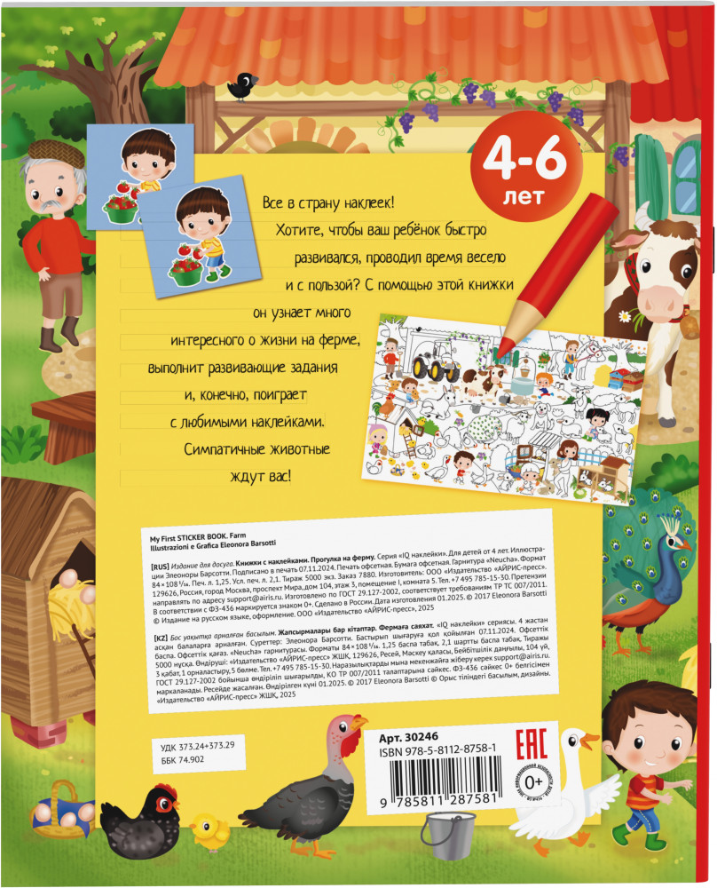 💳 Оплатить за товар можно при получении 🇰🇿 Есть бесплатная доставка по Казахстану от 1 дня 🎁 Копите бонусы с каждой покупки Серия: Книжки с наклейками С помощью этой книжки ребёнок узнает много интересного о животных и растениях фермы. Выполняя игровые задания, он будет искать отличия в рисунках, проходить по запутанным лабиринтам, дорисовывать и раскрашивать картинки. Книга содержит 70 наклеек. На специальном развороте их можно расположить где угодно и создать свою неповторимую картину. Книжку удобно брать в дорогу или на отдых. |