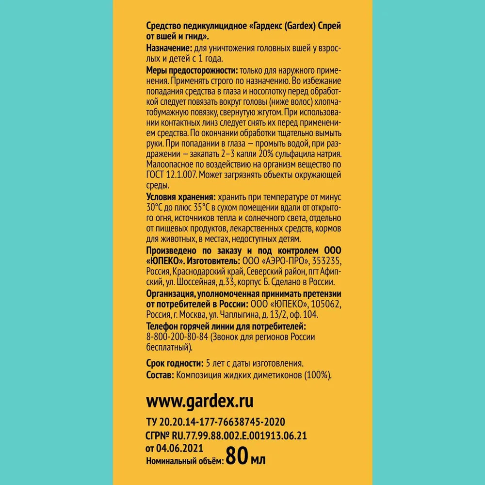 Способ применения: проверьте наличие вшей у всех членов семьи. Для этого осмотрите сухие волосы и кожу головы при хорошем освещении, а также вычешите вшей из влажных волос с помощью частого гребня, который входит в комплект. Вычесывать вшей следует из каждой пряди волос, проводя по ней гребнем несколько раз. Обратите особое внимание на области наиболее частой локализации вшей и гнид — затылок, височную и теменную части головы. После каждого прочесывания протирайте гребень белой салфеткой, на которой вши будут хорошо видны. Всех членов семьи, у которых обнаружены вши, необходимо лечить в один день, чтобы избежать повторного заражения. Перед нанесением средства накройте плечи полотенцем. Снимите с флакона колпачок и, нажимая на клапан-распылитель, равномерно нанесите средство на сухие волосы от корней до кончиков. Расход средства составляет 50-100 мл, в зависимости от длины и густоты волос. Необходимо обеспечить полное покрытие кожи головы и пропитывание волос. Через 15 минут прочешите волосы гребнем для удаления погибших насекомых и яиц (гнид). Вымойте волосы теплой водой с шампунем. Обработку следует повторить через 7-10 дней.