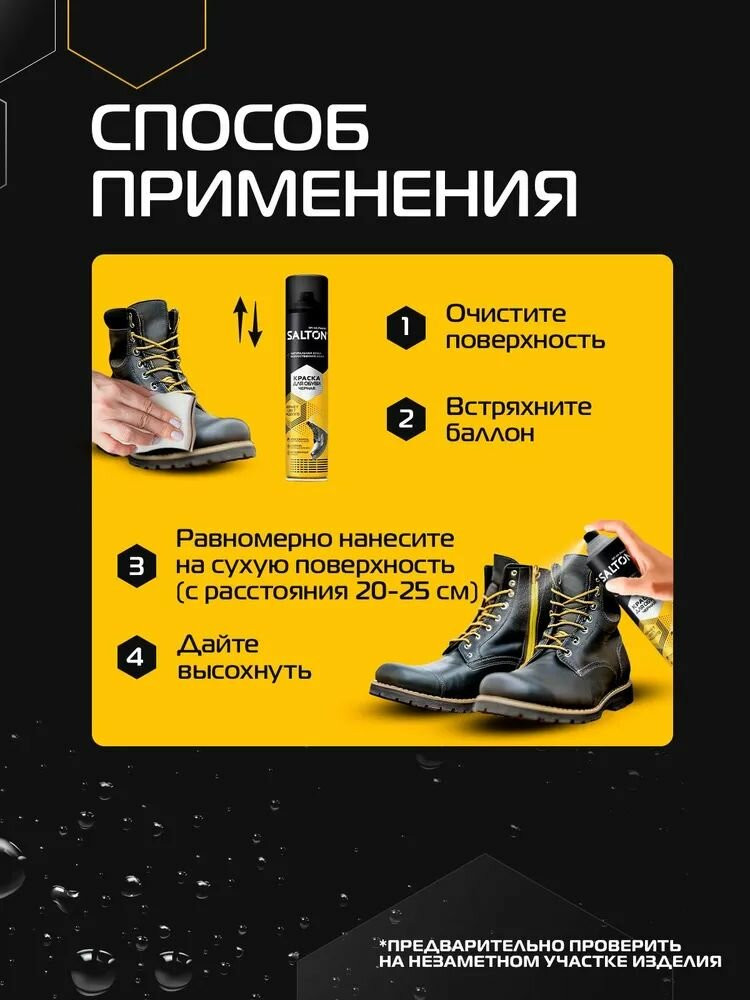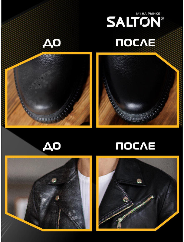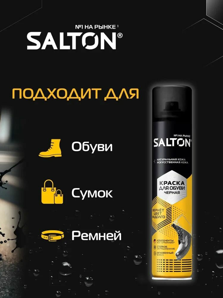 Как обеспечить уход за разными вещами с помощью одного средства? Изделия из гладкой черной кожи будь то обувь, сумки, куртки, ремни одинаково нуждаются в особом уходе для поддержания аккуратного внешнего вида. Под воздействием солнечных лучей, влаги, ветра, а также в результате механических повреждений черная кожа быстро теряет насыщенный цвет, на ней становятся видны потёртости и царапины. Краска для гладкой кожи Salton Standart поможет быстро и без усилий вернуть изделиям из гладкой кожи яркий черный оттенок, замаскировать дефекты, обновить материал и тем самым придать вещам ухоженный вид. Краска для обуви Salton — идеальное решение для всех владельцев обуви, кто ценит качество и внешний вид своих любимых моделей. Безупречно черный оттенок краски позволяет не только освежить и восстановить цвет вашей обуви, но и придать ей новую жизнь.
