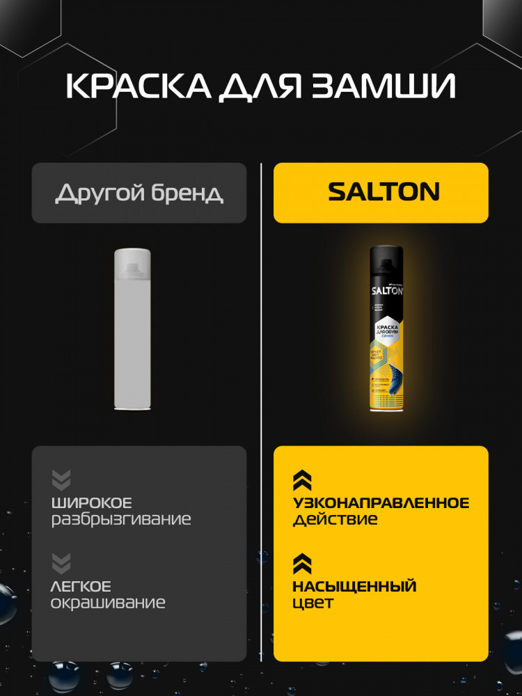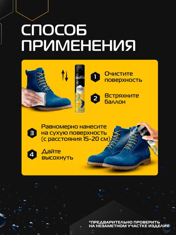 Краска Salton — это не только стиль и качество, но и уход за вашей обувью. Она защищает поверхность обуви от повреждений, сколов и потертостей, придавая ей долговечность и сохраняя первоначальный вид даже после многократного использования. Благодаря нашей краске, вы сможете наслаждаться вашей обувью гораздо дольше, экономя время и деньги на постоянной замене изношенных моделей. Наша краска позволит вам сделать вашу обувь идеальной и безупречной, покрывая поверхность обуви словно жидкая кожа.