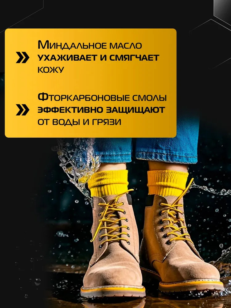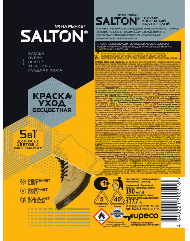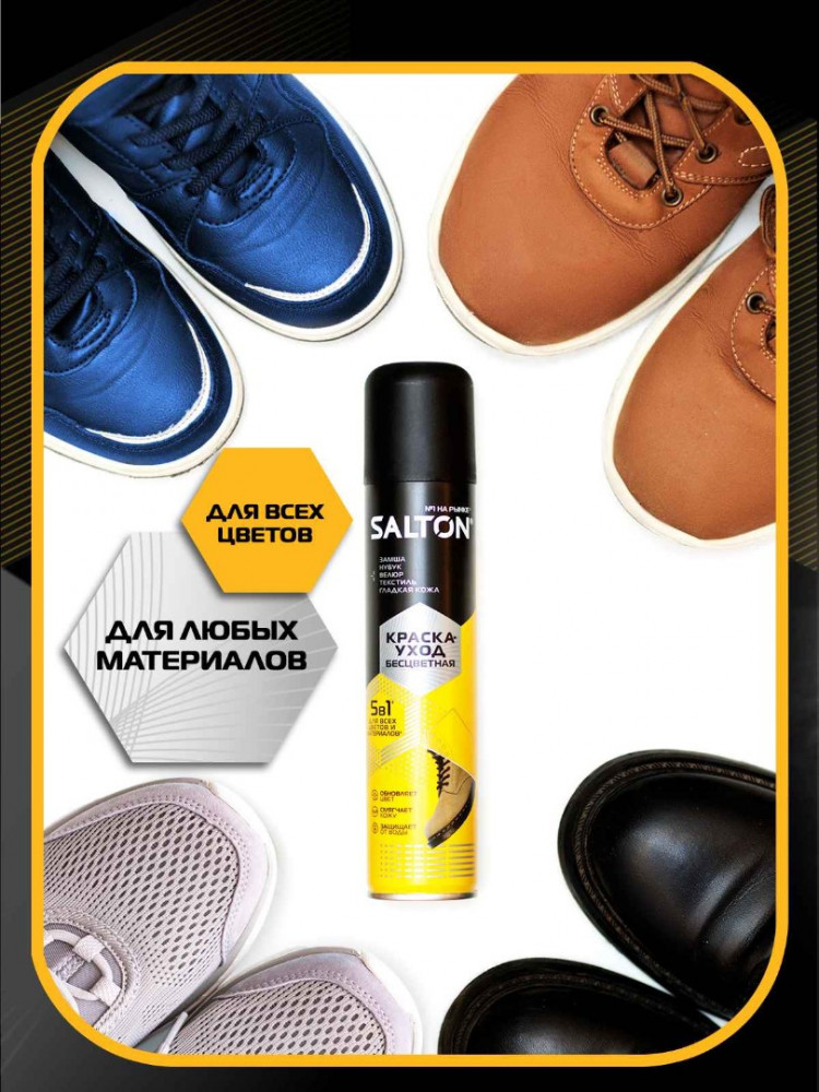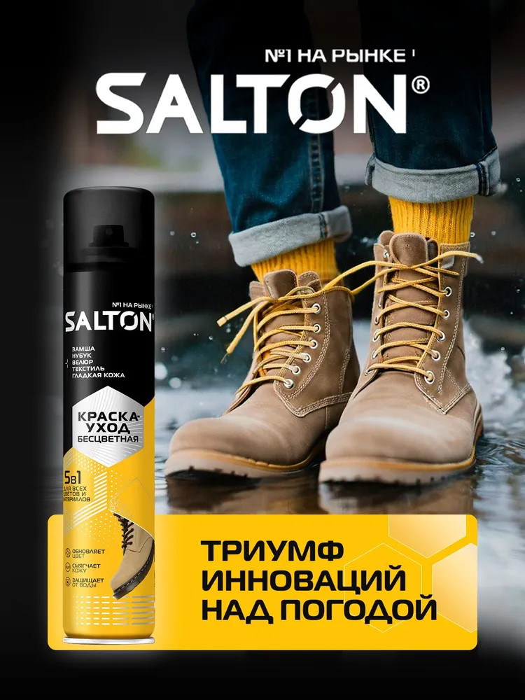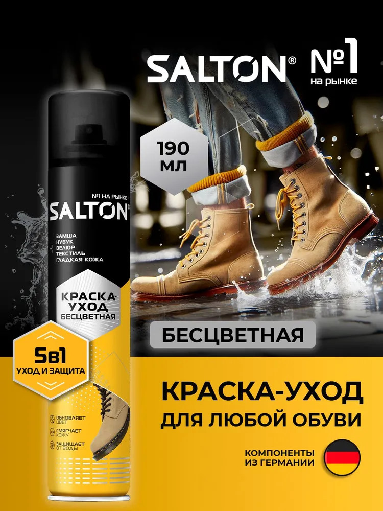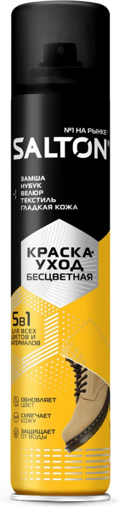 Краска-уход бесцветная Salton — это универсальное средство, которое обеспечивает комплексный уход за обувью из различных материалов и цветов. Спрей Salton выполняет сразу несколько функций: углубляет цвет, ухаживает и смягчает кожу, не повреждая при этом текстиль и замшевые поверхности, обеспечивает защиту от влаги и продлевает жизнь обуви. Это средство для обуви одинаково хорошо подходит для ухода за изделиями из гладкой кожи, замши, нубука, велюра, текстиля и синтетических материалов, включая спортивную обувь и аксессуары.Пропитка для обуви бесцветная Salton — это водоотталкивающее средство, которое обеспечивает надежную защиту обуви от влаги, грязи. Она не только сохраняет внешний вид обуви, но и продлевает ее срок службы, защищая от негативного воздействия внешней среды. Краска-уход от Salton — это незаменимый аксессуар для тех, кто ценит качество и долговечность своей обуви.