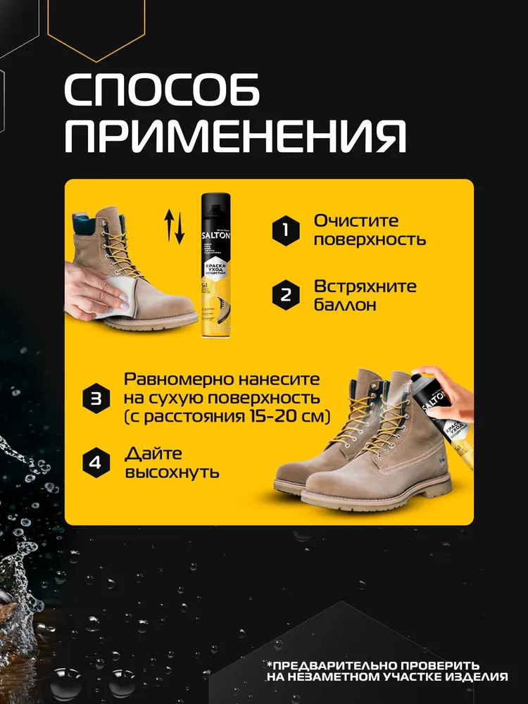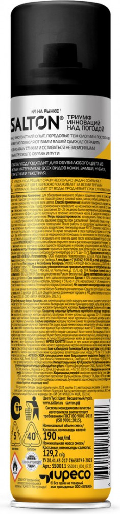 Способ применения: очистите поверхность изделия, можно использовать Пену-очиститель Salton. Перед применением проверьте на незаметном месте изделия! Встряхните баллон. Интенсивно нанесите средство с расстояния 20-25 см, держа баллон вертикально, распылителем вверх. Для максимального эффекта дайте высохнуть в течение нескольких часов. В сырую и влажную погоду рекомендуется ежедневное применение.