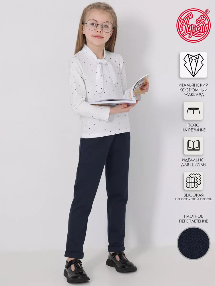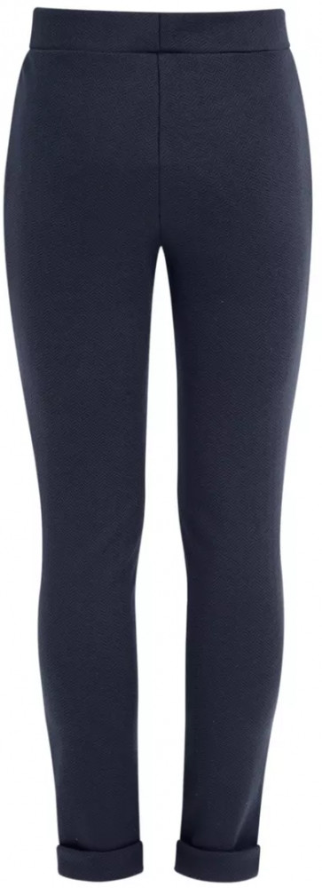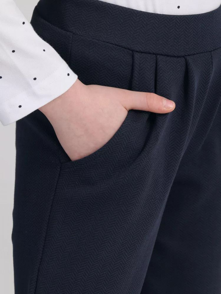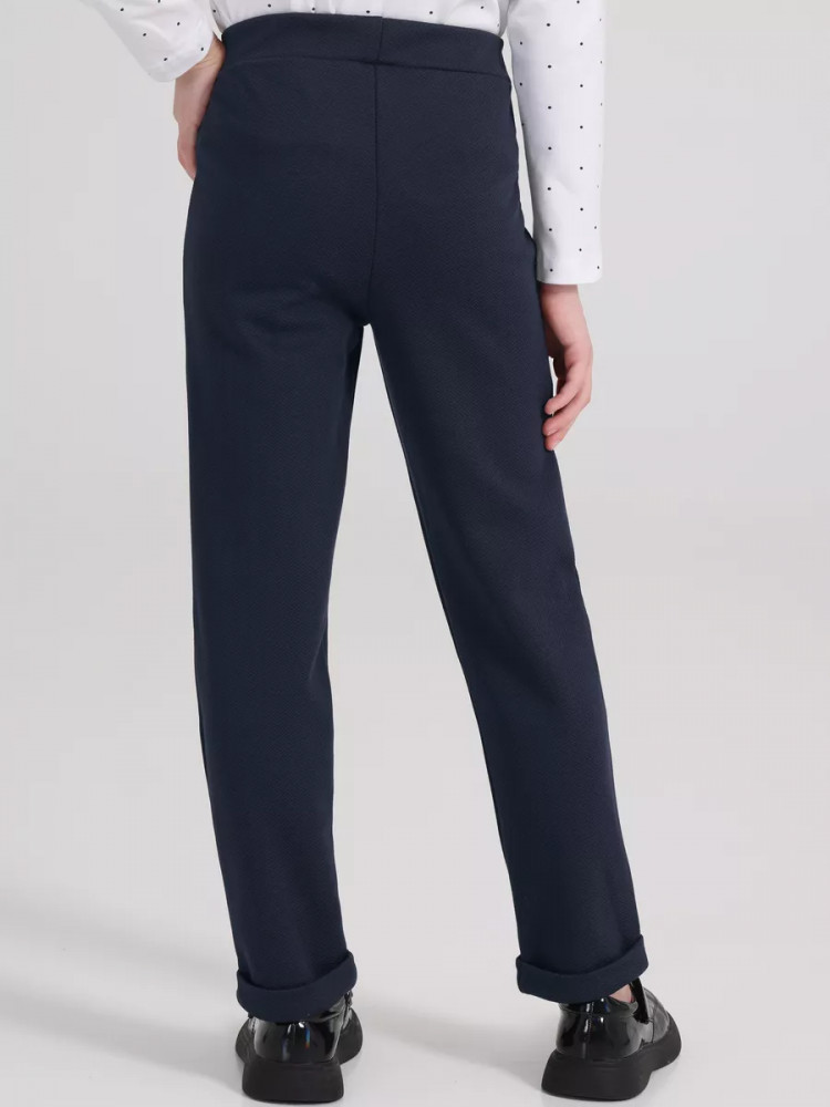 Зауженные брюки для девочки из плотного полотна с рельефным рисунком, выполненным с применением жаккардового плетения. Изделие на эластичном поясе, с удобными кармашками и отворотами по низу. Отличный вариант для школы!