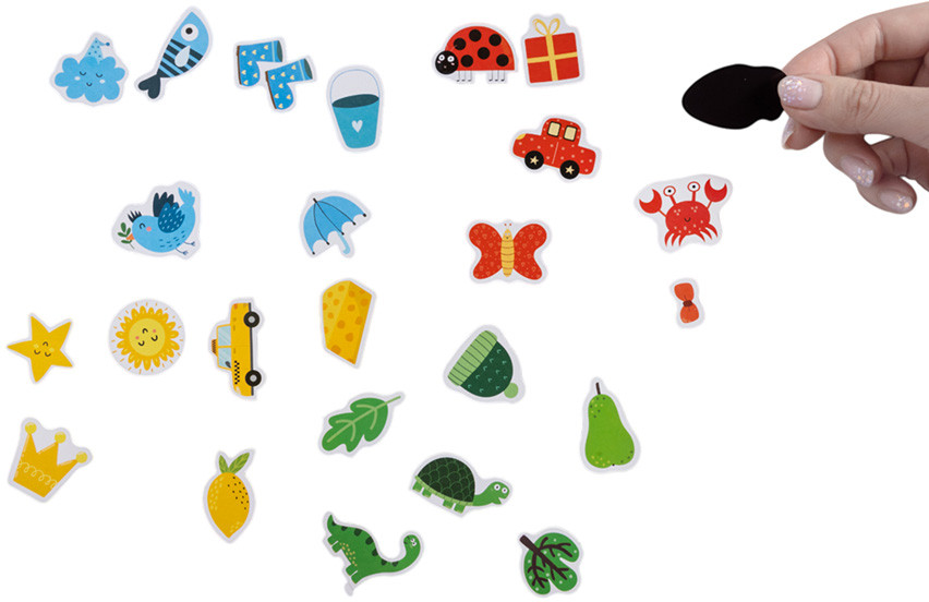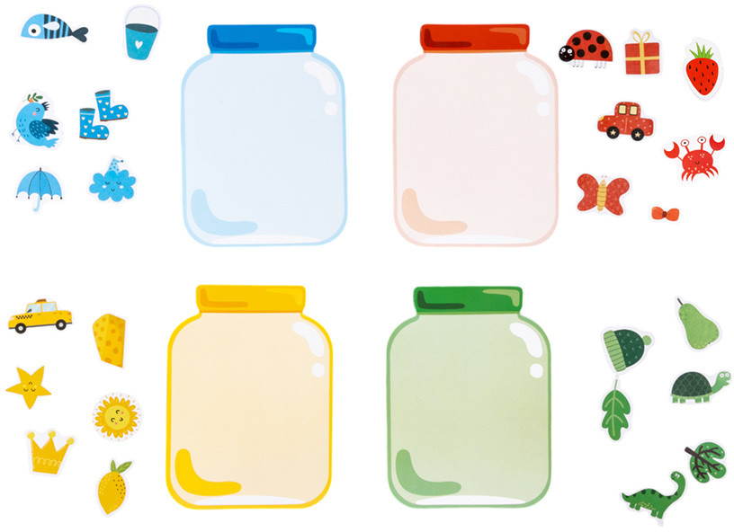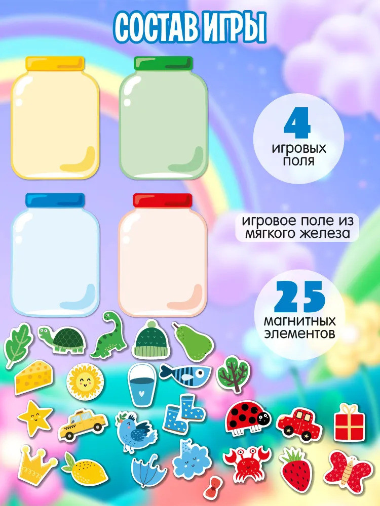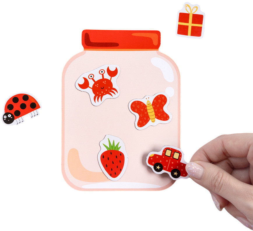 Разложите перед ребенком магнитные элементы (фигурки), предварительно перемешав их. Выберите игровое поле (банку) определенного цвета. Задача ребенка — «сложить» в банку фигурки того же цвета, что и банка. Разноцветные фигурки магнитятся к игровому полю, что делает процесс игры удобным и познавательным.