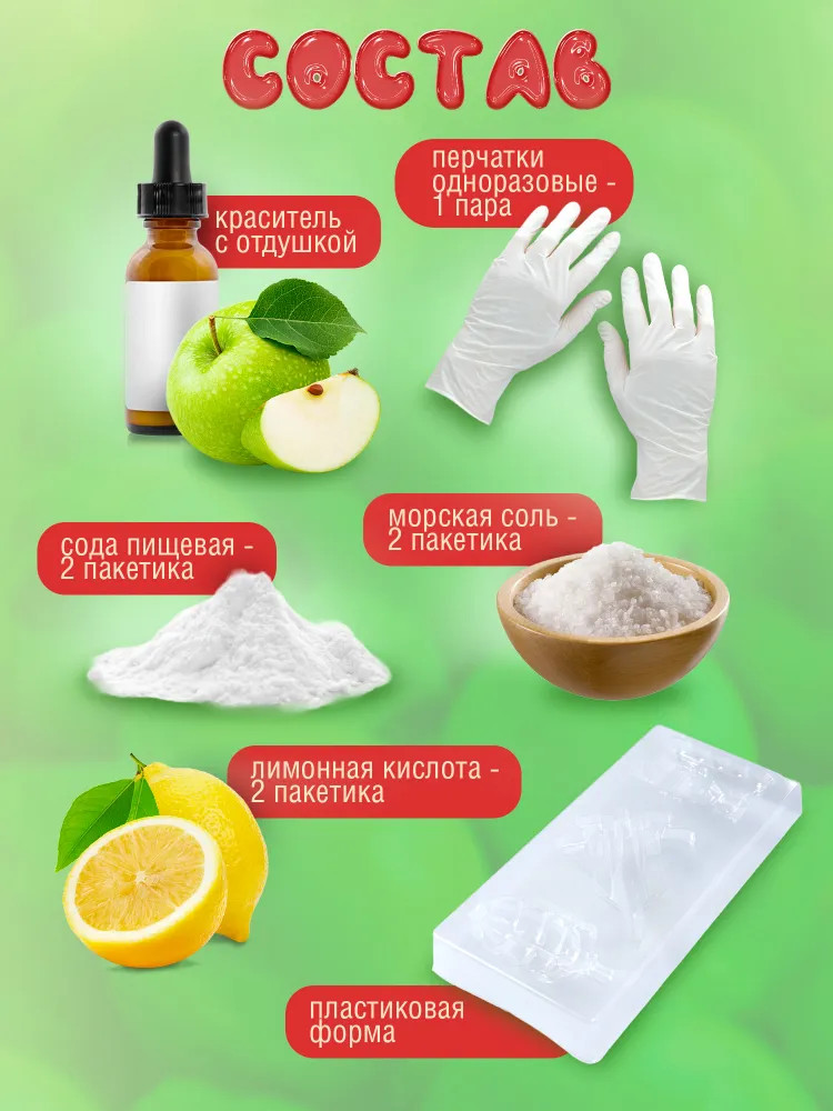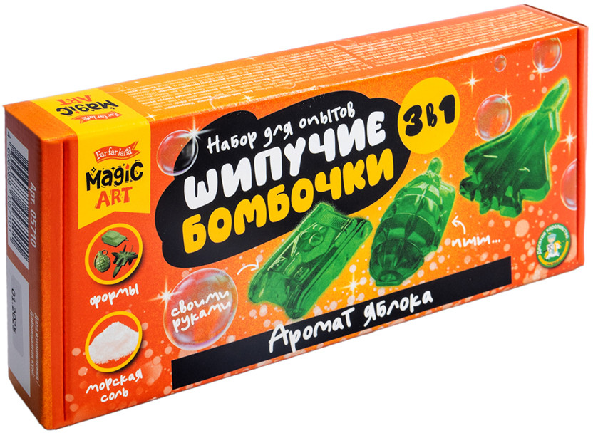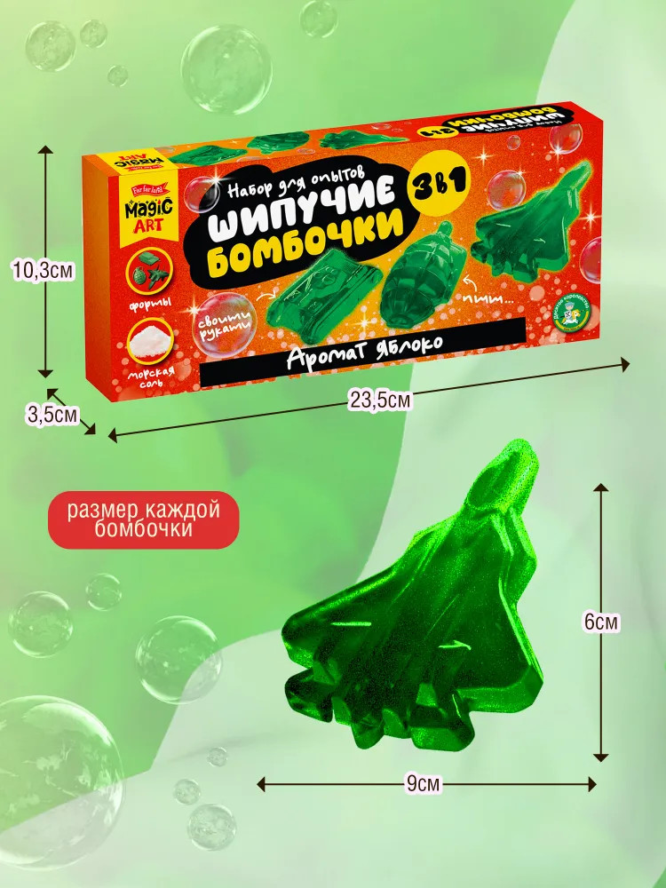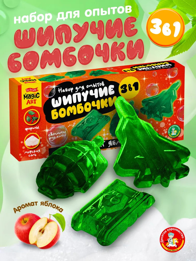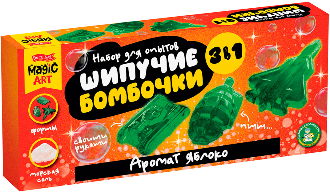 💳 Оплатить за товар можно при получении 🇰🇿 Есть бесплатная доставка по Казахстану от 1 дня 🎁 Копите бонусы с каждой покупки Серия: Magic art С набором для опытов «Шипучие бомбочки. Аромат яблока» вы можете изготовить соляные бомбочки-шипучки в виде танка, гранаты или самолета, которые весело шипят в воде, окрашивая ее, и источают аромат зеленого яблока. |