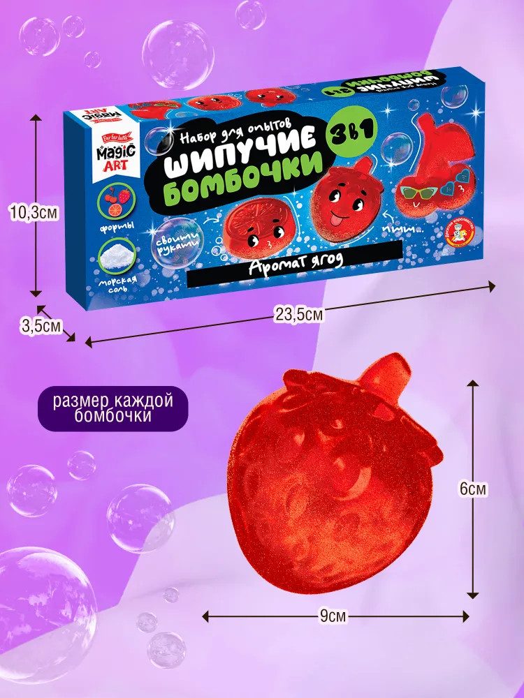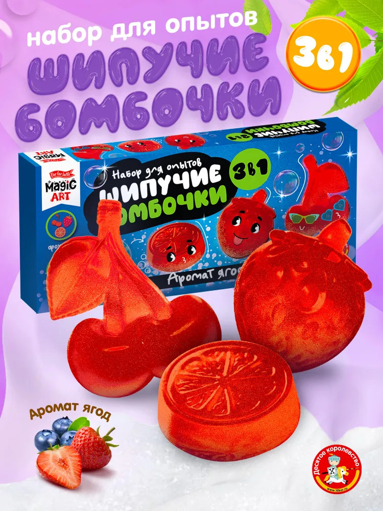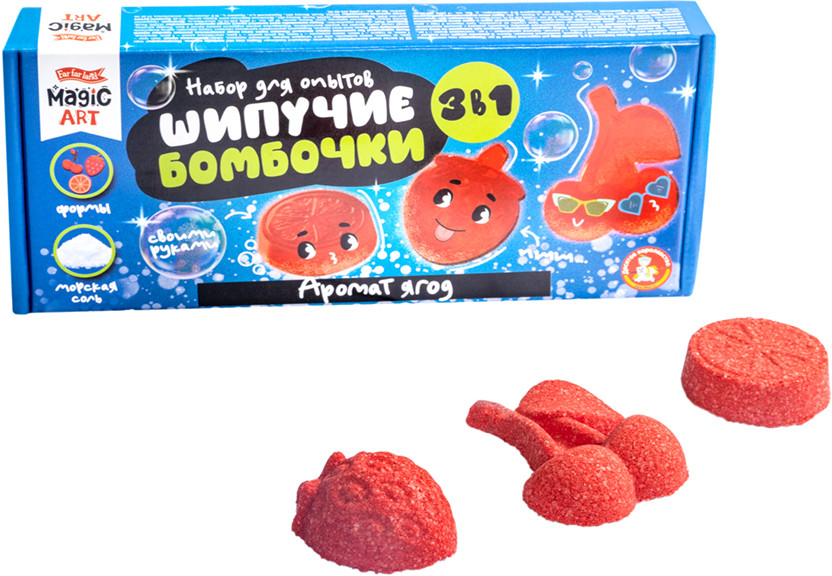 С набором для опытов «Шипучие бомбочки. Аромат ягод» вы можете изготовить соляные бомбочки-шипучки, которые весело шипят в воде, окрашивая ее, и источают сладкий аромат ягод.