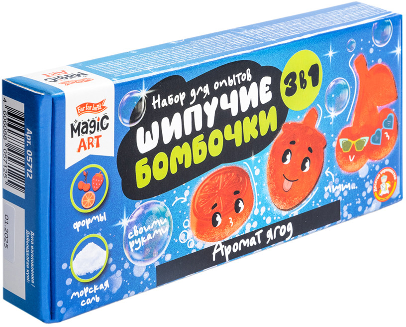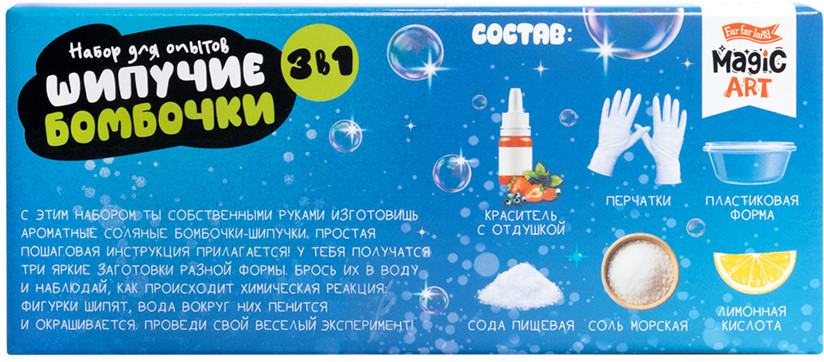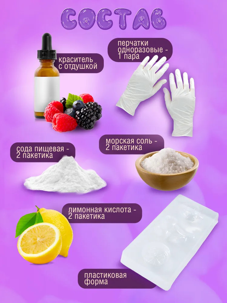 Внимание! Все действия осуществлять под наблюдением взрослых! Ингредиенты и готовое изделие предназначены для наружного применения. Изготовление бомбочки необходимо проводить в сухом проветриваемом помещении. Попадание ингредиентов на кожу, слизистые или в глаза может вызвать их раздражение. Также возможна аллергия на отдельные компоненты набора. В этих случаях место раздражения нужно промыть водой и при необходимости обратиться к врачу. Для удаления красителя с одежды ее достаточно постирать. После растворения бомбочки стенки ванны могут окраситься. Пищевой краситель легко смывается водой с чистящим средством.