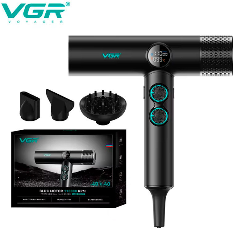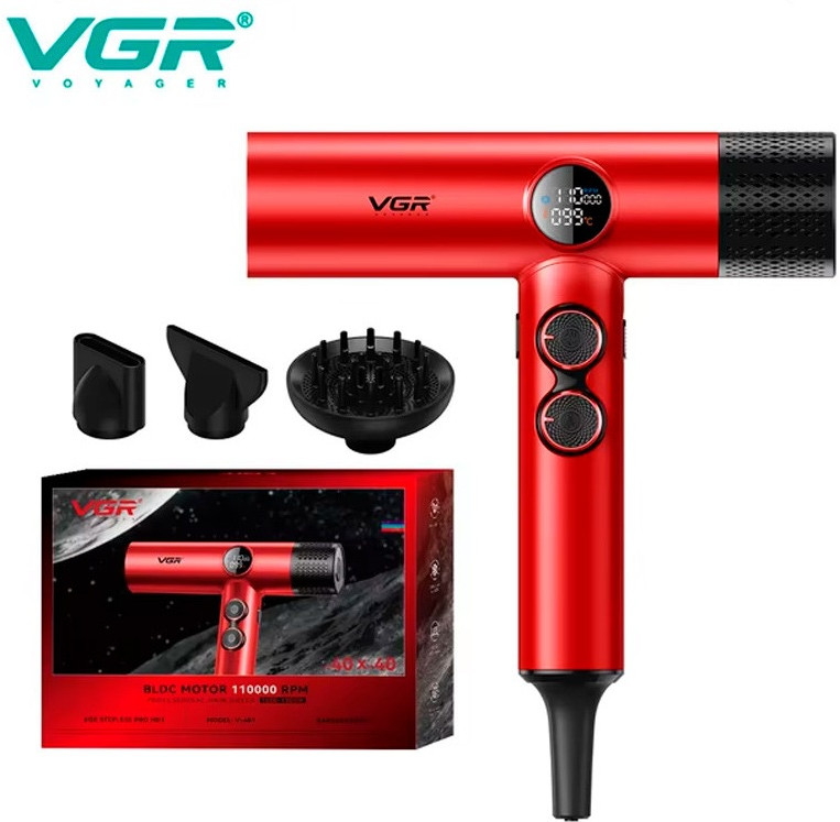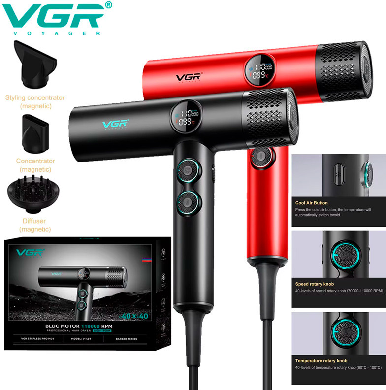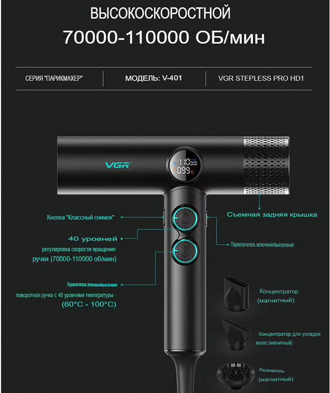 Фен оснащён высокоскоростным бесщеточным двигателем, работающим в диапазоне 70 000–110 000 об/мин. Эта передовая технология обеспечивает долговечность, низкий уровень шума и стабильный поток воздуха. Устройство имеет 40 настроек скорости и 40 уровней температуры (от 60 до 100 °C), что позволяет точно регулировать параметры сушки и укладки. Оснащён магнитными насадками для удобного и быстрого переключения между режимами. Светодиодный дисплей показывает текущие настройки скорости и температуры. Функция мгновенного охлаждения (30 °C) помогает зафиксировать укладку и предотвратить перегрев волос.