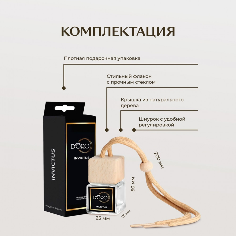 Ароматизатор для авто Invictus — эмоциональная, энергичная и пикантная композиция переливается гранями чувственности, мужественности и силы. Она соткана удивительным переплетением аккордов грейпфрута и морских нот с нежностью жасмина и пряной горечью лаврового листа. Тёплые тона серой амбры, дубового мха, пачули и гуаяка собираются в интересную композицию, настраивающую на непрерывное движение и победы. Ароматизаторы в машину Gamma D’ORO произведены в Турции на заводе, сертифицированном по международным стандартам GMP и ISO.