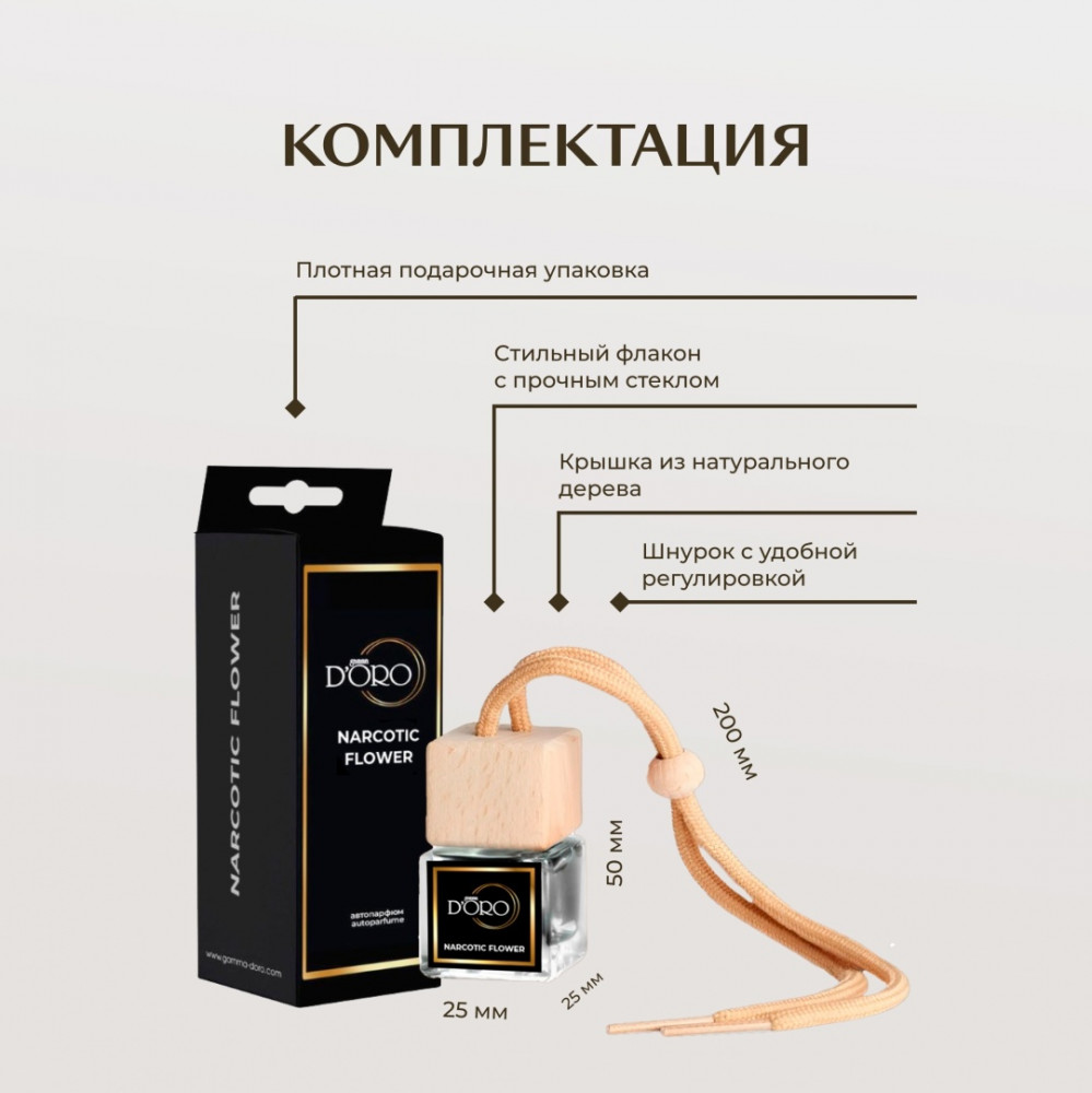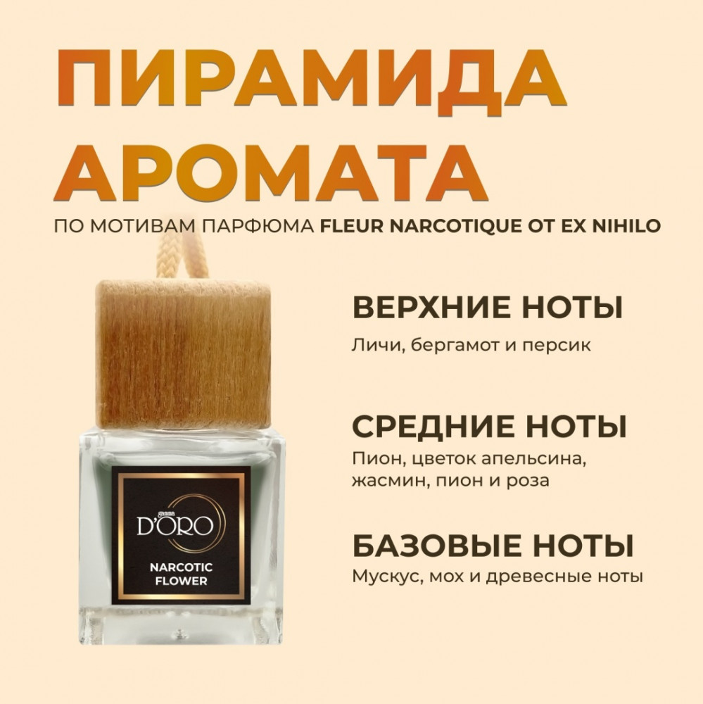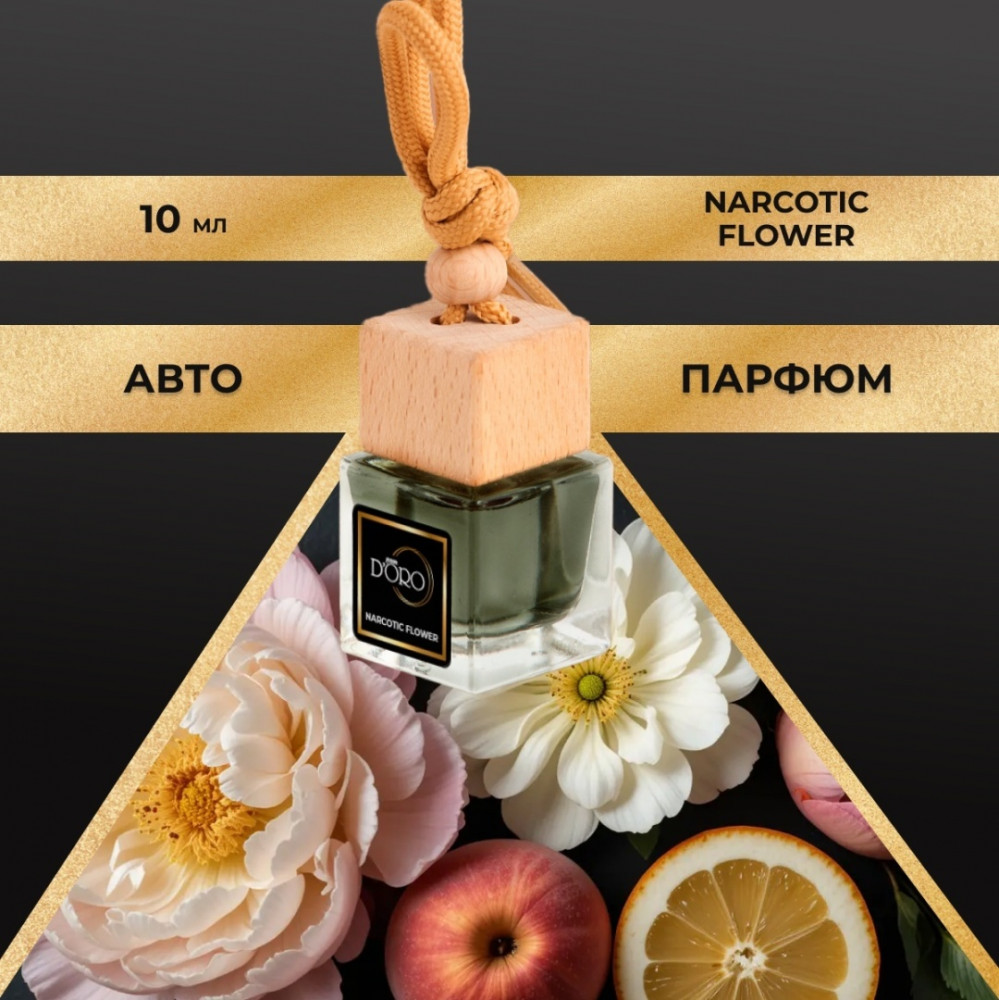 Превратите каждое путешествие в наслаждение, наполненное чувственной и красочной композицией, окутывающей нежной, сладковатой аурой, благодаря нашим уникальным автотоварам — автопарфюму для автомобиля «Narcotic Flower» от Gamma D’oro. Ароматизатор в машину переплетает оттенки звонкого бергамота, экзотического личи и райского персика с цветочным великолепием пышного пиона.