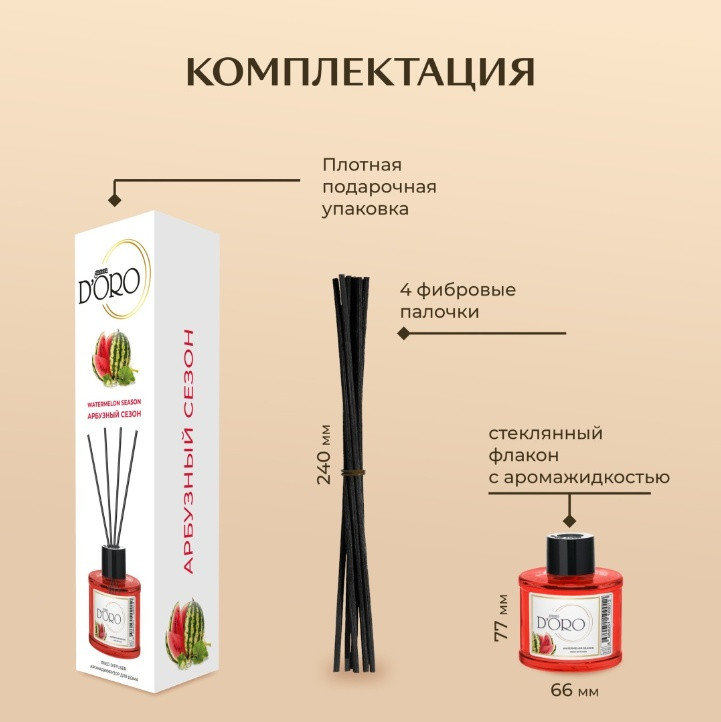 Наполните свой дом ароматом безграничной свежести со сладким послевкусием с помощью нашего аромадиффузора с палочками «Арбузный сезон» от Gamma D’oro. Наш парфюм для дома имеет мягкий, деликатный аромат арбуза, сочный и сахарный одновременно, — универсальный аромат для дома. Ароматический диффузор с палочками произведен с Турции на специализированном парфюмерном заводе, сертифицированном по всем международным стандартам. Жидкость для диффузора содержит французские аромамасла, а палочки для диффузора изготовлены из качественного волокна, обеспечивая равномерную отдачу аромата до 8 недель. Диффузор с натуральными эфирными маслами укрепляет иммунитет и улучшают самочувствие, абсолютно безопаснен для детей и животных.
