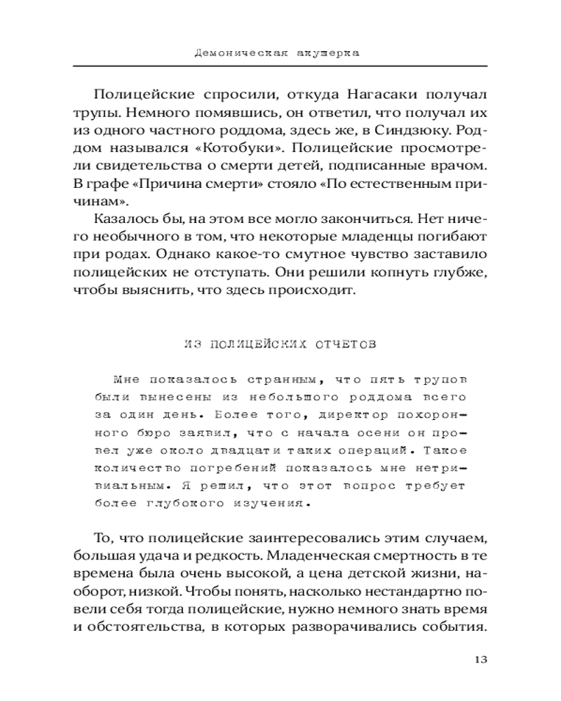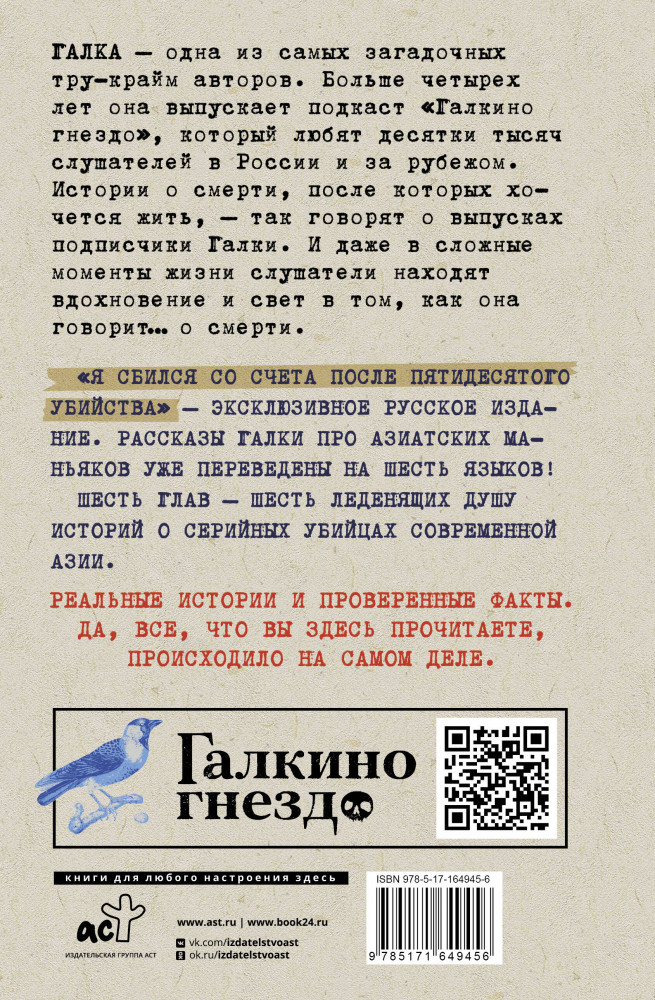 Я сбился со счета после пятидесятого убийства. Серийные убийцы Азии. Основано на реальных событияхВ данный момент этот товар отсутствует в продаже. Возможно, у нас найдется аналогичный или похожий товар здесь. Серия: Криминология на пальцах «Я сбился со счета после пятидесятого убийства» — цикл криминальных историй о самых известных серийных маньяках современной Азии. Каждый рассказ содержит подробное описание жизни и личности преступника — его культурного, экономического и социального происхождения. Автор внимательно изучает преступления, чтобы понять: что движет человеком, который не может остановиться и прекратить убивать? Правительства азиатских стран тщательно скрывают всю информацию о подобных кровавых происшествиях, поэтому автору пришлось провести настоящее расследование, чтобы написать эту книгу. Шесть глав — шесть леденящих душу историй о серийных убийцах современной Азии. |