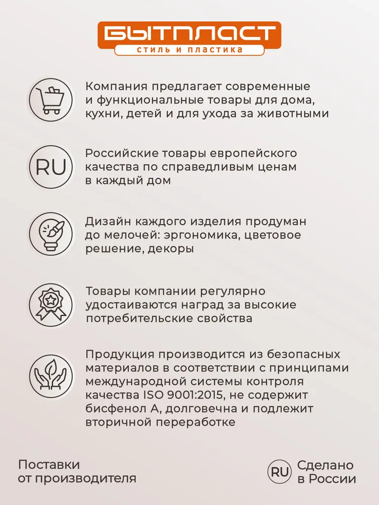 | Компания «Бытпласт» — это ведущий российский производитель высококачественных изделий из пластика и пластмассы. Наша компания специализируется на создании разнообразных товаров для повседневной жизни, включая хозтовары, товары для дома и сада, детские товары, кухонные принадлежности и пластиковую посуду. Наш ассортимент разнообразен, и мы рады предложить оптовые поставки наших продуктов. Мы придерживаемся строгих стандартов качества при производстве всех наших товаров. Это гарантирует... |