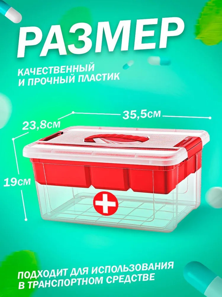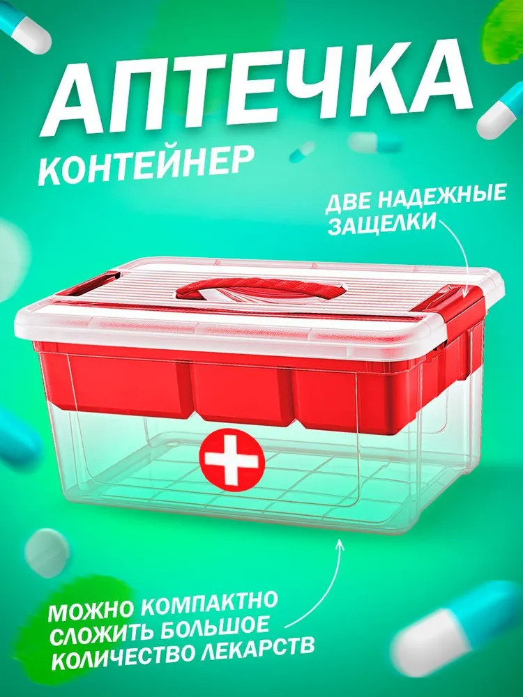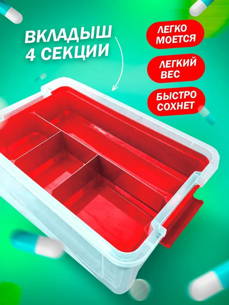 Контейнер «StorMax Аптечка» — универсальный домашний органайзер для хранения медикаментов и других лекарственных средств. Изделие представляет собой прочный пластиковый ящик размером 238×355×190 мм с крышкой, которая с двух сторон запирается клипсами-защелками, надежно защищает содержимое от пыли и препятствует выпадению аксессуаров при переноске. Для удобства использования конструкцию дополняет вкладыш с разделением на ячейки. Медицинские инструменты, аптечные пузырьки и таблетки распределяются по секциям, не теряются, не перемешиваются и находятся под рукой в нужный момент. Вставка легко вынимается и освобождает доступ к препаратам на нижнем ярусе. Ручка «прячется» в специальное углубление сверху, удобна для транспортировки емкости. Материал корпуса — пищевой пластик легкий и долговечный, не содержит токсинов и запаха, не вызывает аллергию и неприхотлив в уходе. Бокс для лекарств пригодится как дома, так и в автомобиле. Вместительный инвентарь это практичность, функциональность и забота о здоровье. В нашем магазине найдете и другие полезные товары, подарок для близких или оригинальную вещь для себя. Приятных покупок.