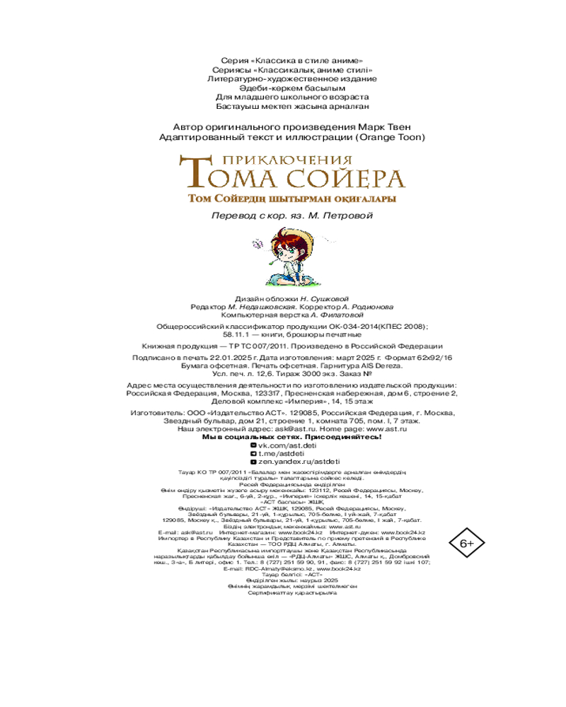 💳 Оплатить за товар можно при получении 🇰🇿 Есть бесплатная доставка по Казахстану от 1 дня 🎁 Копите бонусы с каждой покупки Серия: Классика в стиле аниме Приготовьтесь к увлекательному путешествию с Томом Сойером — любопытным и озорным мальчиком, который и дня прожить не может без приключений. То он хочет стать индейским вождём, то разбойником и даже пиратом. Куда же приведут Тома его шалости? В этой книге он и его лучший друг Гекльберри Финн втягиваются в захватывающие приключения, которые заставят вас улыбаться и удивляться. |