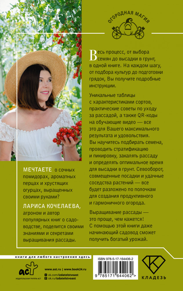 💳 Оплатить за товар можно при получении 🇰🇿 Есть бесплатная доставка по Казахстану от 1 дня 🎁 Копите бонусы с каждой покупки Серия: Огородная магия Мечтаете о сочных помидорах, ароматных перцах и хрустящих огурцах, выращенных своими руками? Лариса Кочелаева, агроном и автор популярных книг о садоводстве, поделится своими знаниями и секретами выращивания рассады. Весь процесс, от выбора семян до высадки в грунт, в одной книге. На каждом шагу, от подбора культур до подготовки грядок, Вы получите подробные инструкции. Уникальные таблицы с характеристиками сортов, практические советы по уходу за рассадой, а также QR-коды на обучающие видео — всё это для Вашего максимального результата и удовольствия. Вы научитесь подбирать семена, проводить стратификацию и пикировку, закалять рассаду и определять оптимальное время для высадки в грунт. Севооборот, совмещенные посадки и удачные соседства растений — всё будет разложено по полочкам для создания продуктивного и гармоничного огорода. Выращивание рассады — это проще, чем кажется! С помощью этой книги даже начинающий садовод сможет получить богатый урожай. |