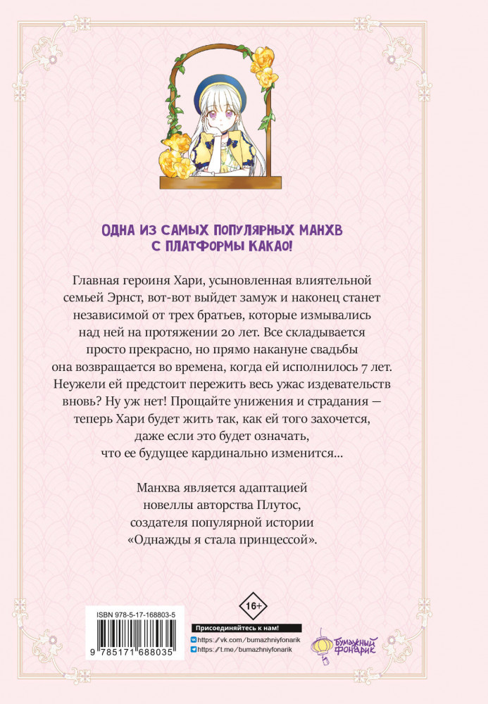 💳 Оплатить за товар можно при получении 🇰🇿 Есть бесплатная доставка по Казахстану от 1 дня 🎁 Копите бонусы с каждой покупки Серия: Вебтун. Берегись этих братьев! Влиятельная семья Эрнст, в отчаянной попытке заполнить пустоту после утраты своей дочери, усыновляет девочку по имени Хари. Новые родители искренне любят приемную дочь, но их родные сыновья, братья Эрнст, начинают издеваться над Хари. Проходит много лет, и, кажется, страдания вот-вот окончатся: завтра состоится свадьба Хари, которая позволит ей покинуть этот негостеприимный дом навсегда. Когда девушка засыпает, ей кажется, что все горести остались позади. Но, проснувшись, Хари вновь оказывается в детстве. Она решает, что, если ей выпала возможность прожить свою жизнь заново, на этот раз все будет так, как она сама того пожелает. Сможет ли она изменить свою судьбу? Оригинальное произведение создано писателем по имени Плутос, который также является автором новеллы «Однажды я стала принцессой». |