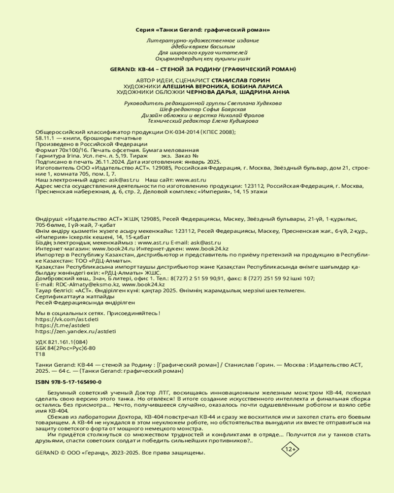 💳 Оплатить за товар можно при получении 🇰🇿 Есть бесплатная доставка по Казахстану от 1 дня 🎁 Копите бонусы с каждой покупки Серия: Танки Gerand: графический роман Безумный советский учёный Доктор ЛТГ, восхищаясь инновационным железным монстром КВ-44, пожелал сделать свою версию этого танка. Но отвлёкся! В итоге создание искусственного интеллекта и финальная сборка остались без присмотра... Нечто, получившееся случайно, оказалось почти одушевлённым роботом и взяло себе имя КВ-404. Сбежав из лаборатории Доктора, КВ-404 повстречал КВ-44 и сразу же восхитился им и захотел стать его боевым товарищем. А КВ-44 не нуждался в этом неуклюжем роботе, но обстоятельства вынудили их вместе отправиться на защиту советского форта от мощного немецкого монстра. Им придётся столкнуться со множеством трудностей и конфликтами в отряде... Получится ли у танков стать друзьями, спасти советских солдат и победить сильнейших противников?.. |