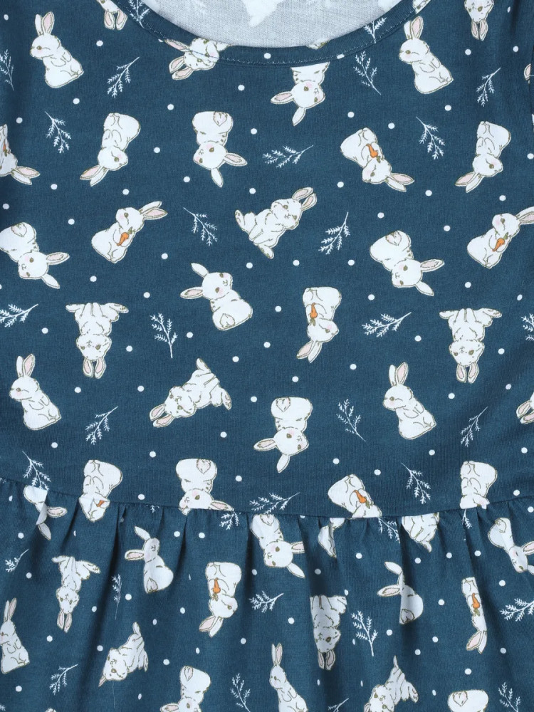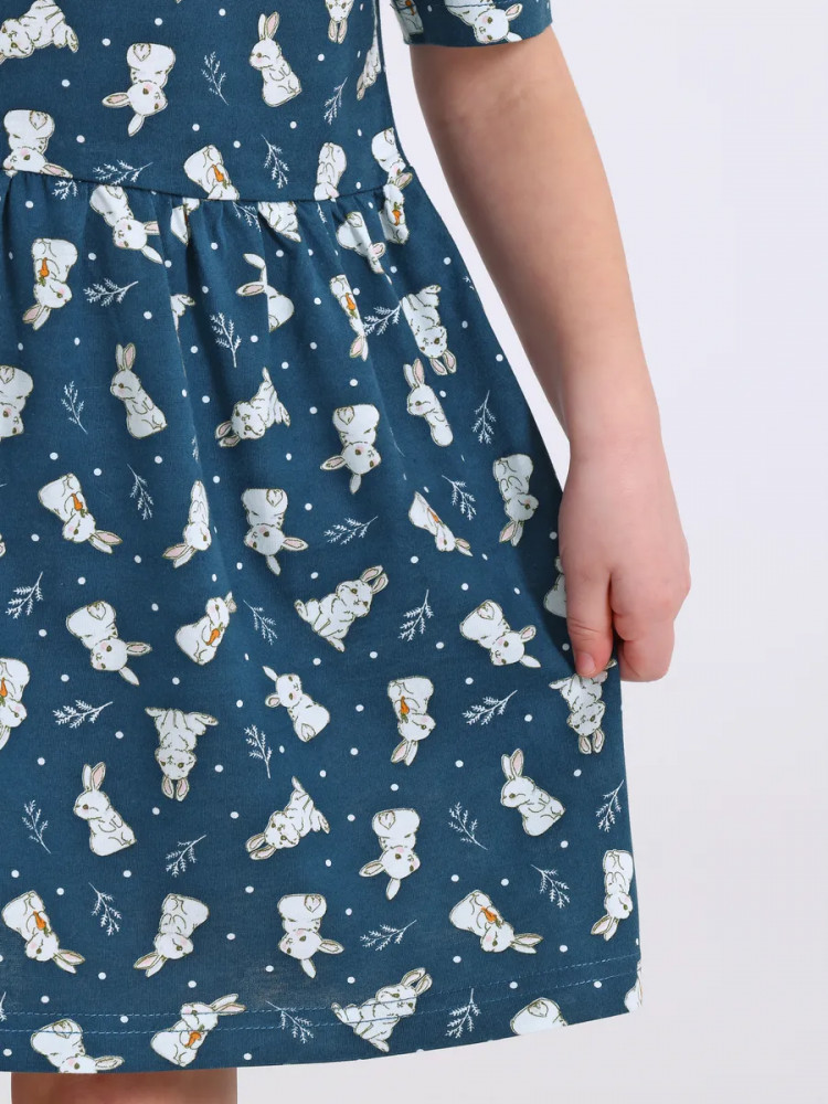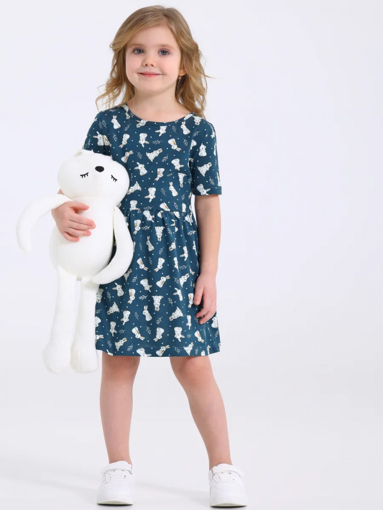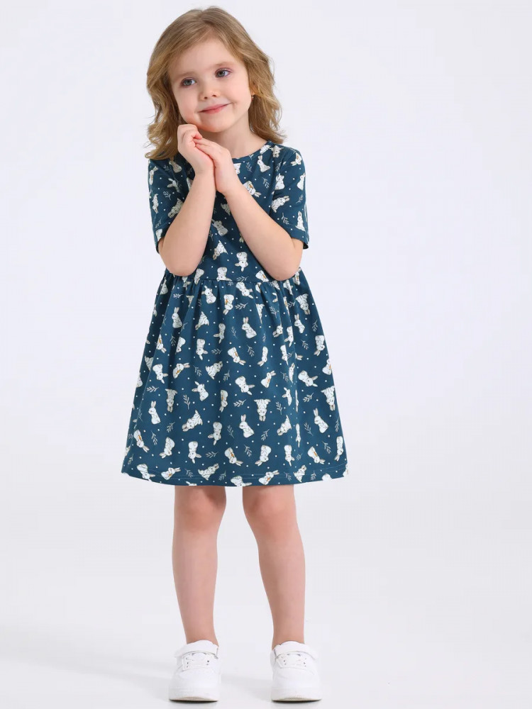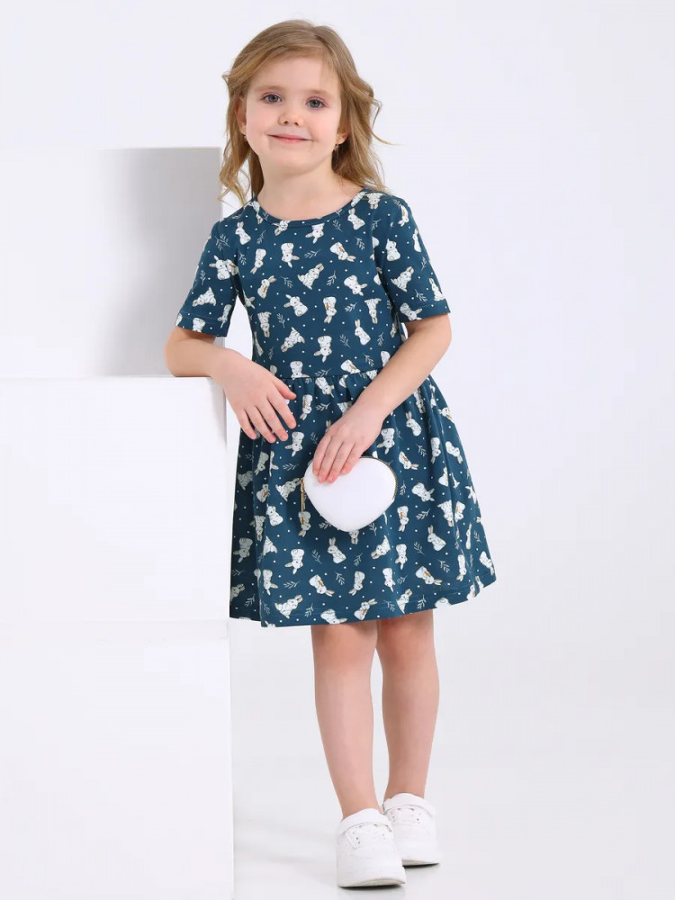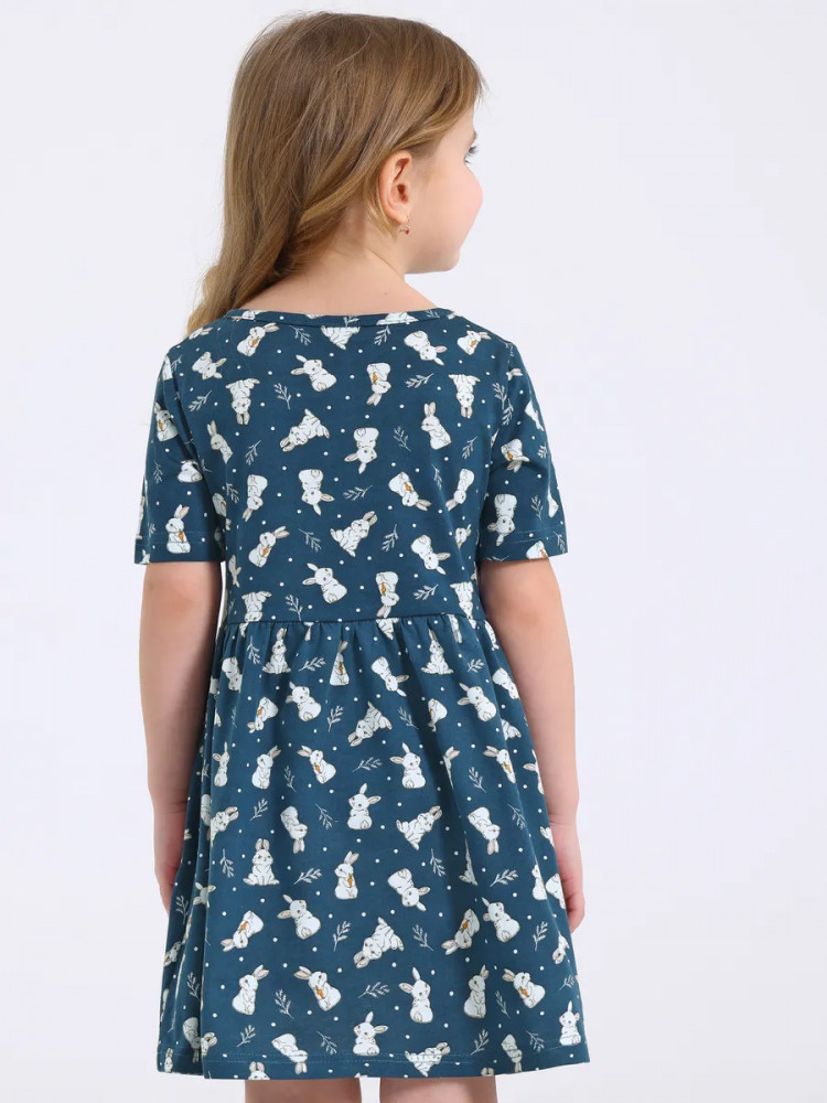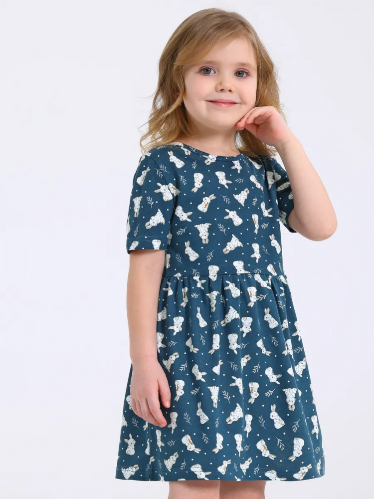 Платье для девочки выполнено из кулира — легкого хлопкового набивного полотна. Изделие с короткими рукавами, юбочка присборена по линии талии.