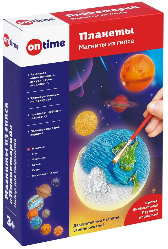 On Time Магниты из гипса «Планеты»В данный момент этот товар отсутствует в продаже. Возможно, у нас найдется аналогичный или похожий товар здесь. С набором для творчества «Планетарий» можно создать целую коллекцию магнитов в виде планет Солнечной системы. Изготовить оригинальные магниты своими руками несложно — просто разведите гипс водой и залейте полученный раствор в формы, а после застывания раскрасьте их красками и приклейте к обратной стороне магнитные стикеры. В результате получатся 8 магнитов: 7 планет — Меркурий, Венера, Земля, Марс, Юпитер, Сатурн, Плутон — и 1 спутник — Луна. |