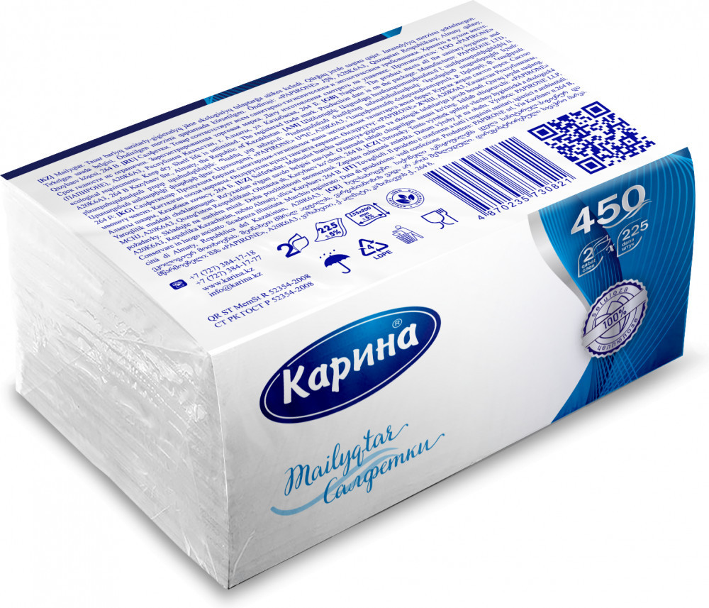 Казахстанская компания производитель бумажной санитарно-гигиенической продукции. Туалетная бумага и салфетки фирмы «Карина» — стандарт «де-факто» в домашнем хозяйстве и на производстве. |