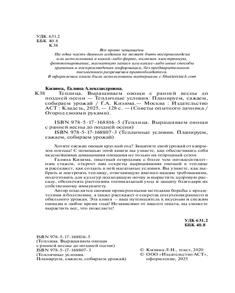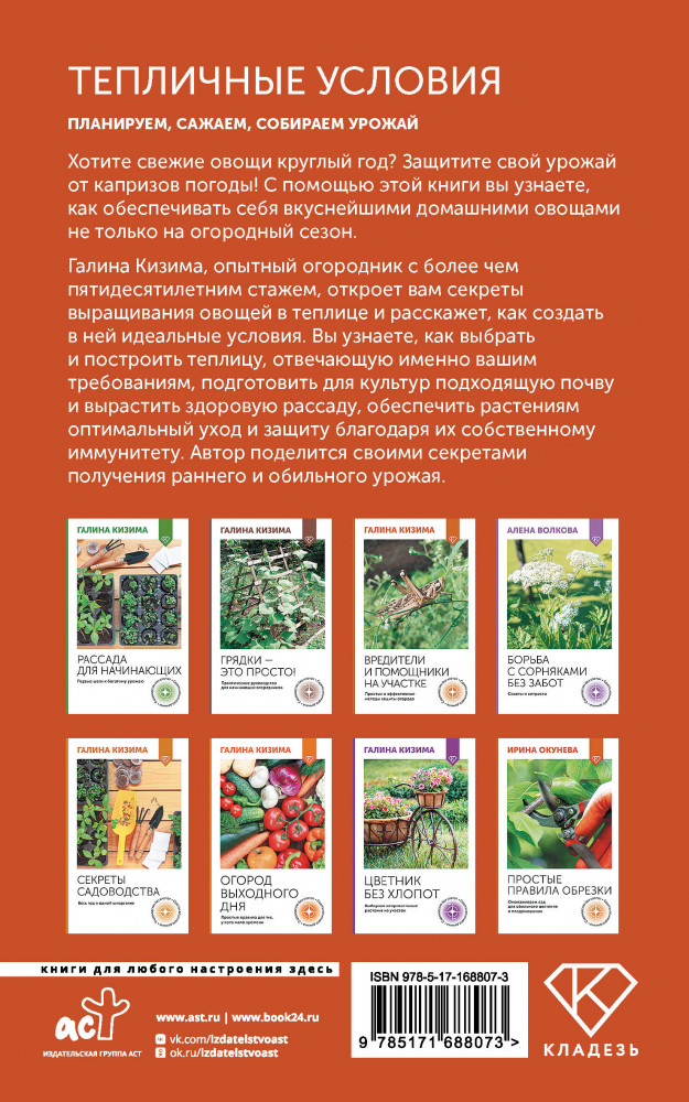 💳 Оплатить за товар можно при получении 🇰🇿 Есть бесплатная доставка по Казахстану от 1 дня 🎁 Копите бонусы с каждой покупки Серия: Огород своими руками Хотите свежие овощи круглый год? Защитите свой урожай от капризов погоды! С помощью этой книги вы узнаете, как обеспечивать себя вкуснейшими домашними овощами не только на огородный сезон. Галина Кизима, опытный огородник с более чем пятидесятилетним стажем, откроет вам секреты выращивания овощей в теплице и расскажет, как создать в ней идеальные условия. Вы узнаете, как выбрать и построить теплицу, отвечающую именно вашим требованиям, подготовить для культур подходящую почву и вырастить здоровую рассаду, обеспечить растениям оптимальный уход и защиту благодаря их собственному иммунитету. Автор поделится своими проверенными методами борьбы с вредителями и болезнями, а также расскажет о секретах получения раннего и обильного урожая. Эта книга — ваш путеводитель к вкусным и свежим овощам в любое время года! Независимо от вашего опыта, вы сможете вырастить всё, что пожелаете! |