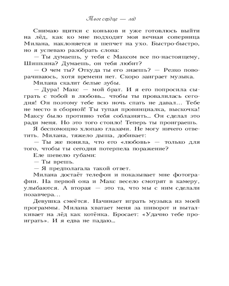 Серия: Ледяная страсть Катя — амбициозная фигуристка, которая мечтает добиться высоких результатов в большом спорте. Знакомство с Максимом впервые открывает ей мир за пределами катка, и, хотя отношения не входили в ее планы, Максим стал для нее приоритетом чуть ли не наравне с золотой медалью. Но что, если он не тот, за кого себя выдает? И почему во всем этом чувствуется присутствие Миланы, главной конкурентки Кати на большом льду? |
