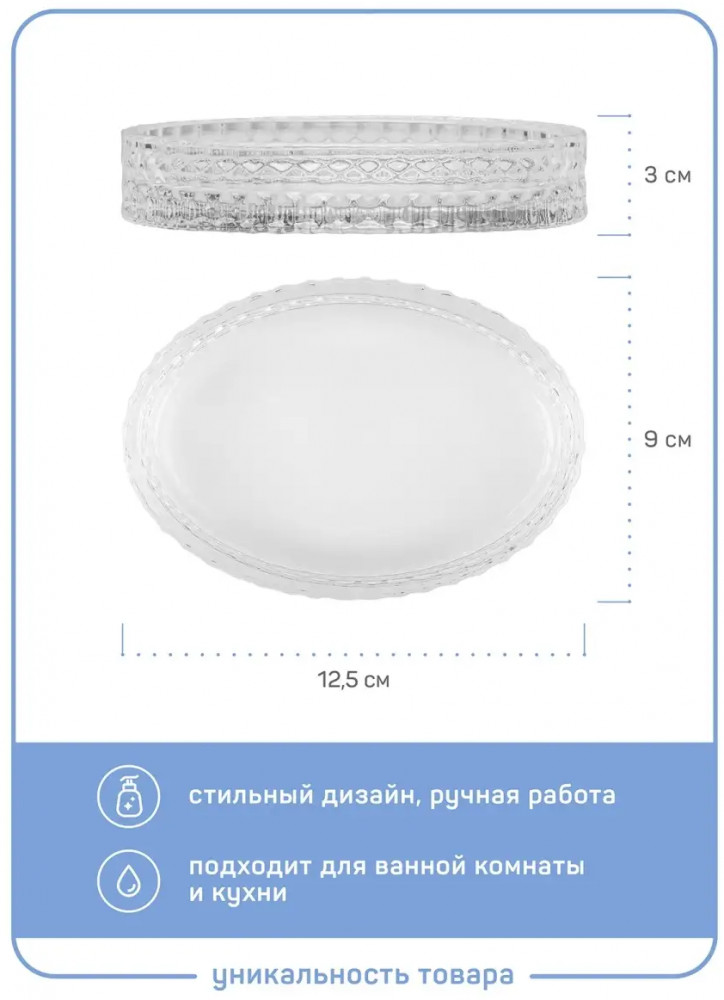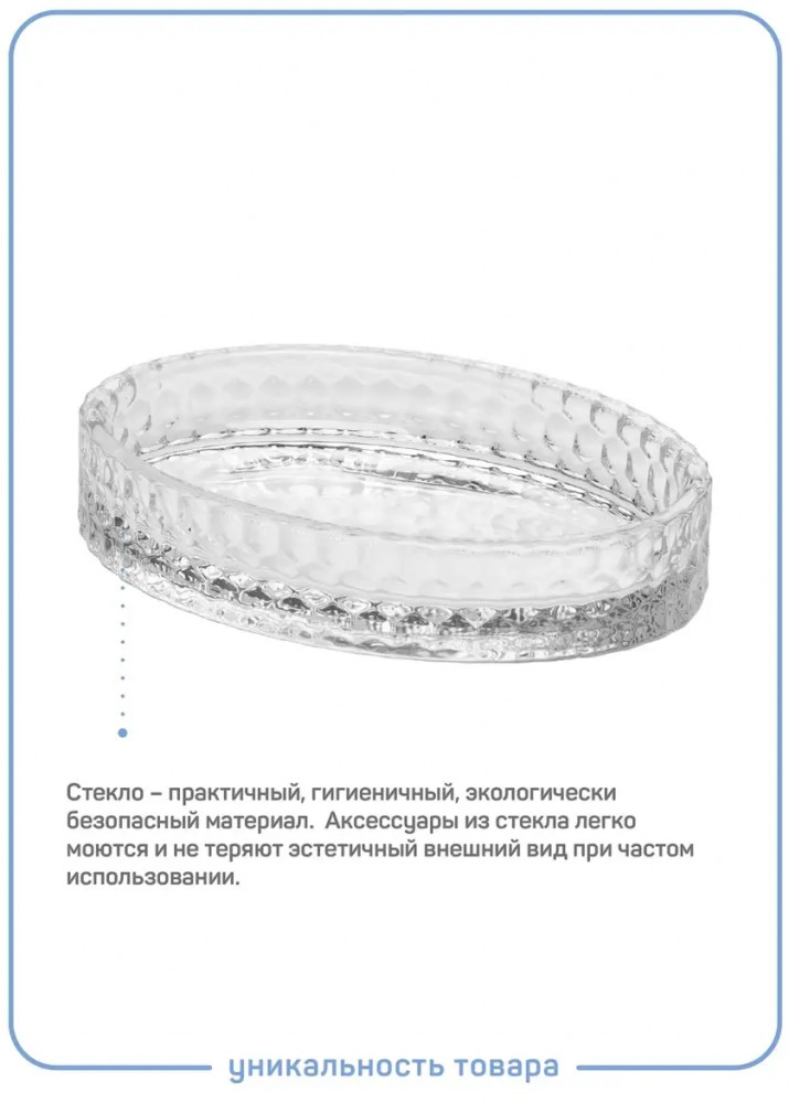 Серия: Crystal Подставка-мыльница Crystal. Подойдет как для хранения мелких вещей, так и по прямому назначению для хранения мыла. Входит в состав коллекции Crystal. Стеклянная мыльница — это стильный и функциональный аксессуар для ванной комнаты, предназначенный для хранения мыла губок и косметических спонжей. Аксессуары для ванной из стекла — идеальное решение для создания стильной и функциональной обстановки в вашей ванной комнате. Впишется на раковину и на столешницу, в шкаф и на стиральную машинку. Красиво будет смотреться на любом косметическом столике и даже на рабочем столе. |