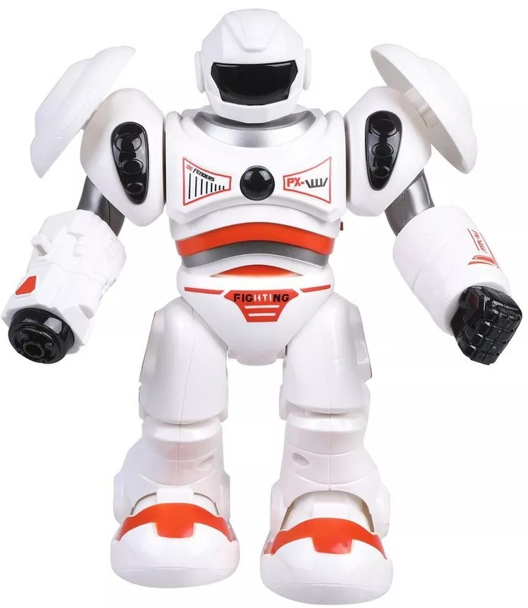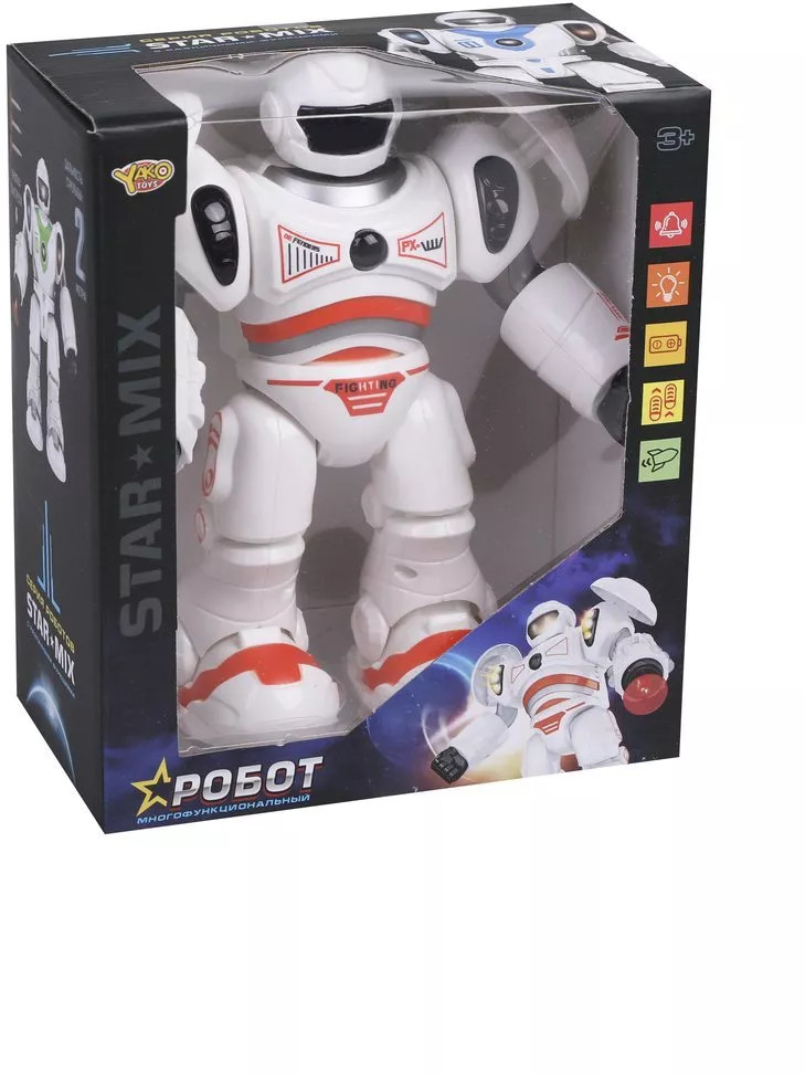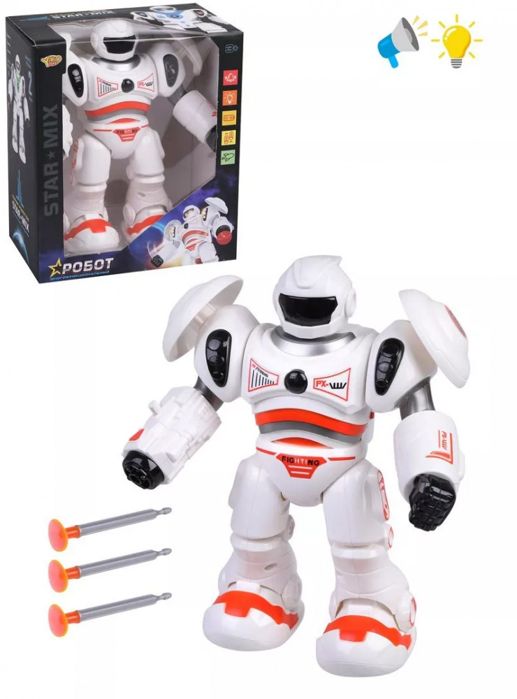 Робот электрифицированныйВ данный момент этот товар отсутствует в продаже. Возможно, у нас найдется аналогичный или похожий товар здесь. Многофункциональный робот со светом и звуком. Робот передвигается шагами, воспроизводит звуки стрельбы и светится в области корпуса и шлема. Также игрушка может стрелять ракетами: кнопка запуска ракет находится на руке у робота. В комплекте прилагаются 3 ракеты с присосками. Дальность стрельбы: 1,5-2 метра. Размер робота — 18×10×21 см |