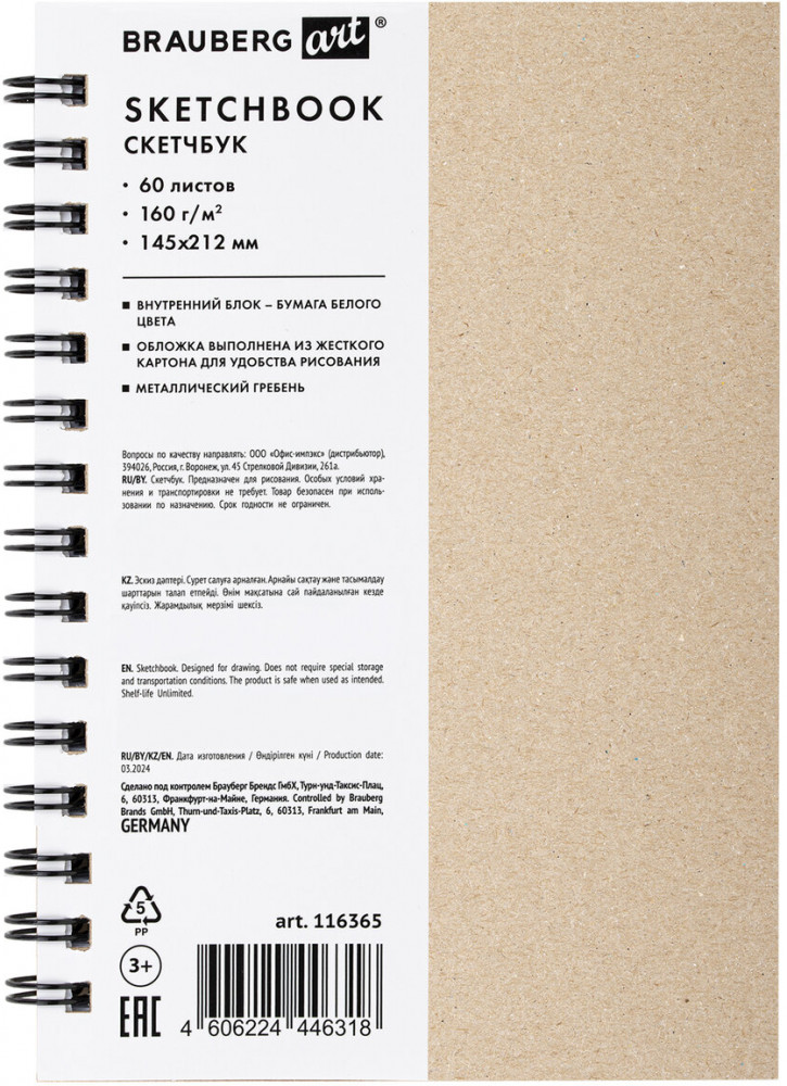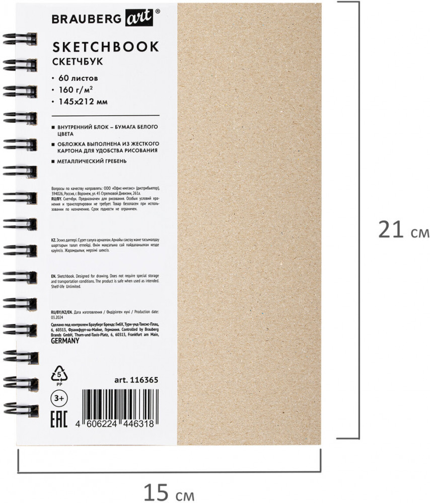 Скетчбук имеет размер 150×210 мм и содержит 60 белоснежных листов плотностью 160 г/м2 с гладкой текстурой. Листы удобно скреплены спиралью, что позволяет раскрывать их на 360°. Минималистичная обложка без дизайна может быть оформлена яркими наклейками и стикерами. Твердая обложка позволяет делать зарисовки и наброски на весу. Бумага не съедает цвет, оставляя яркие цвета неизменными.