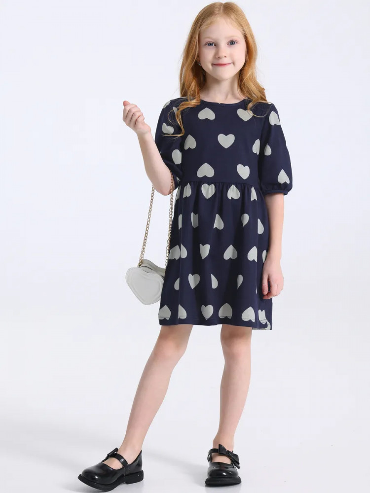 Платье для девочки выполнено из кулира — легкого хлопкового полотна. Изделие с рукавами-фонариками, собранными по низу на эластичную тесьму, юбочка присборена по линии талии, застежка на пуговицу по спинке.
