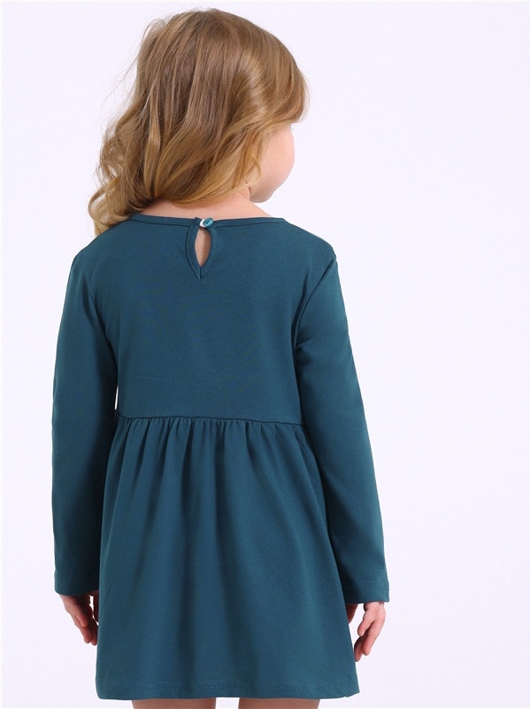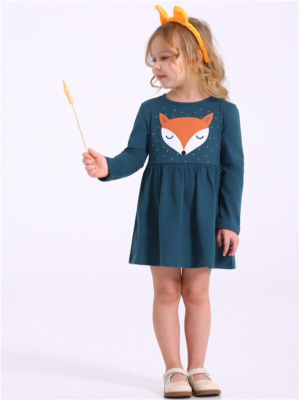 Платье для девочки выполнено из кулира — лёгкого хлопкового полотна с лайкрой. Изделие с длинными рукавами и с присборенной по талии юбочкой, застежка на пуговицу по спинке, украшено печатью.